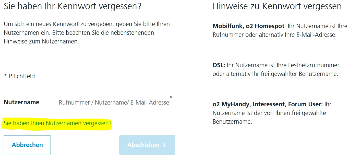 Wenn du beim zweiten Vertrag schon eine Registrierung vorgenommen und den Nutzernamen vergessen hast, gehe bitte einmal bei Kennwort vergessen auf den Link “Sie haben Ihren Nutzernamen vergessen?”: