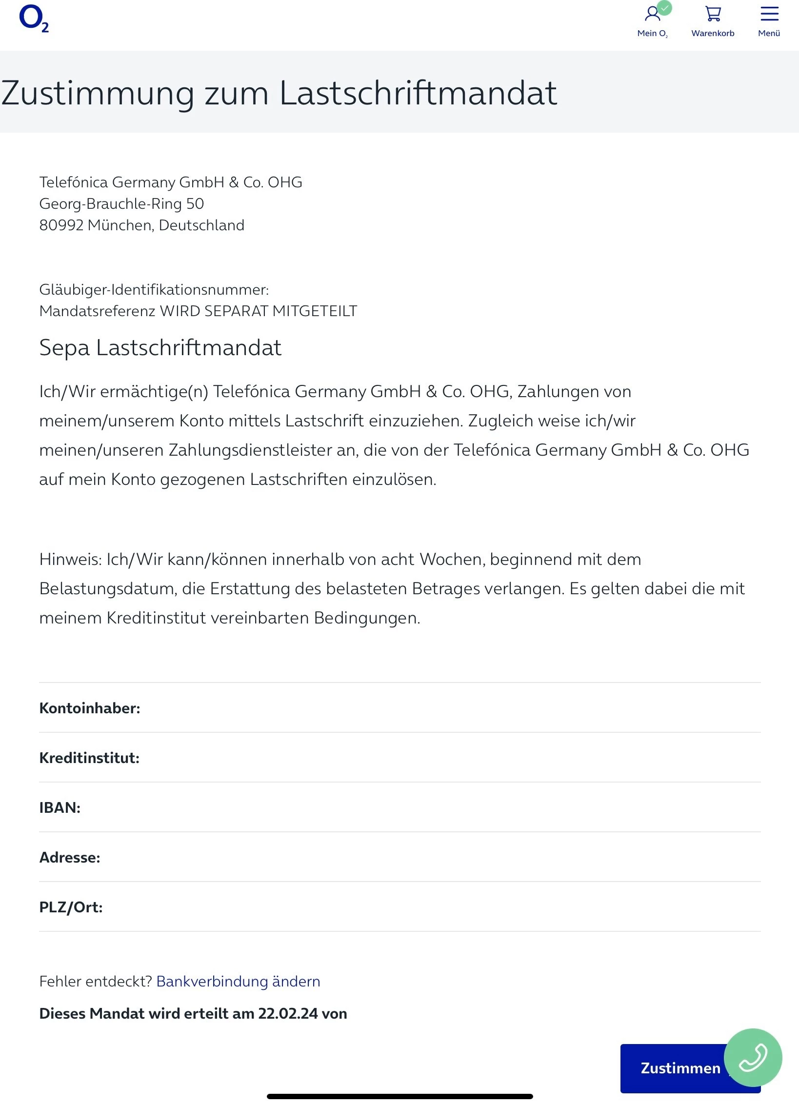 Ich bin nicht sicher, aber wenn du dich in Mein o2 einloggst, sollte der SEPA Hinweis da auch stehen.