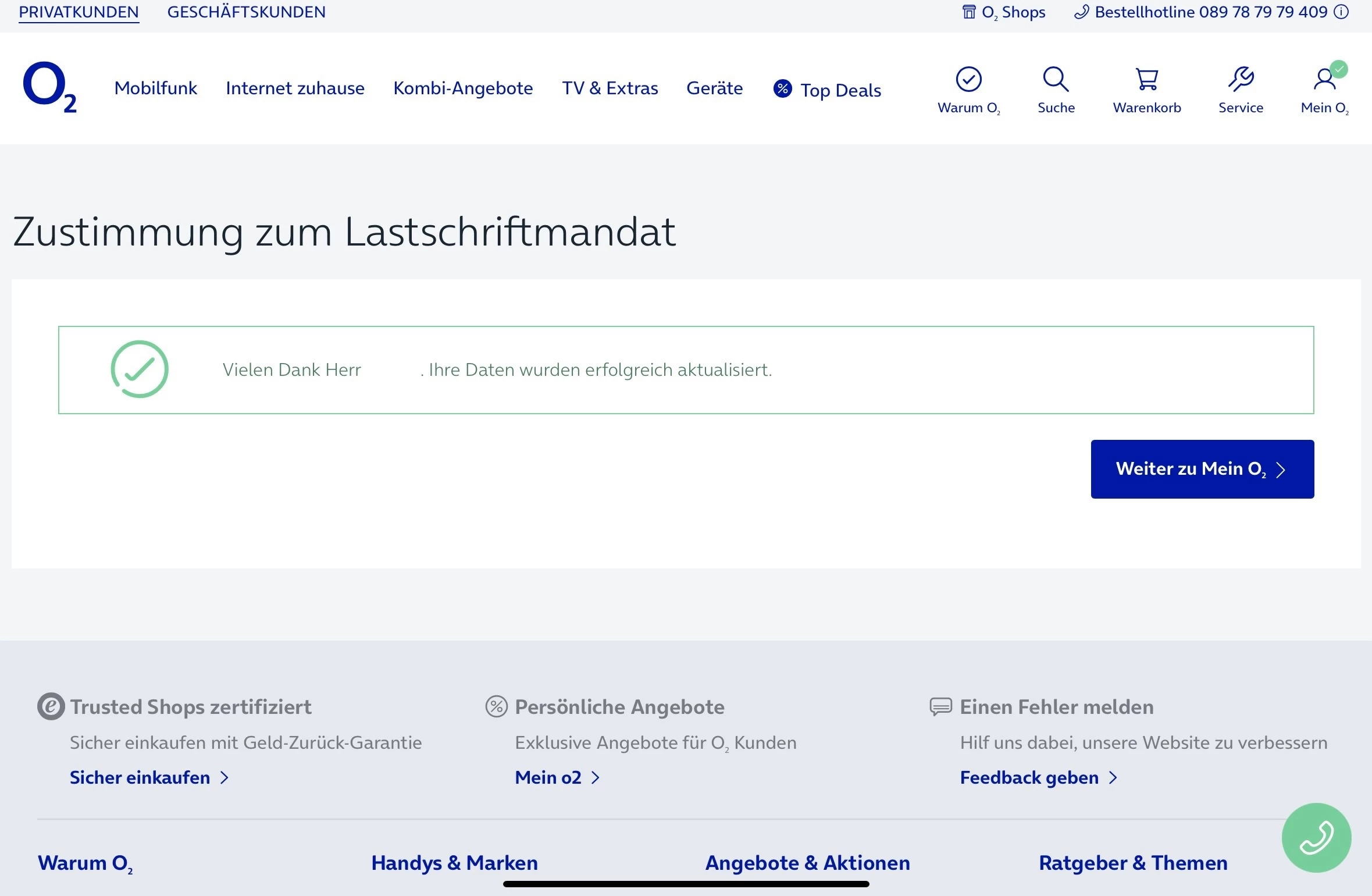 ich habe heute über den Kundenservice mein Sepa Mandat erneuert. Die nette Mitarbeiterin hatte erwähnt, so wie @o2_Solveig, dass sie den Mandat senden Knopf drückt. Anschließend konnte ich das im Kundenportal selbstständig bestätigen. Ich habe davon Bilder gemacht: