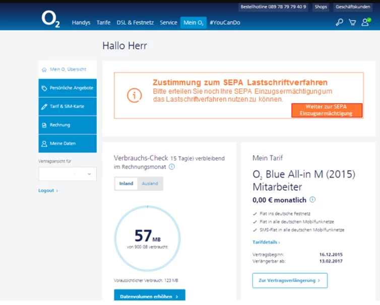 Ich alle unter Mein Vertrag angezeigten Gruppen wie ... Meine o2 Übersicht, Tarife, Wechsel und Meine Angebot öffnen. Aber keine SEPA Meldung vorhanden.