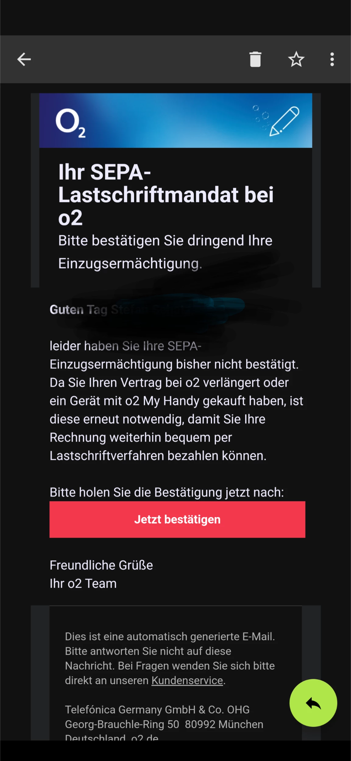 Hallo, nein. Nur per Mail von o2- Team als Absender mit no reply. In der Betreffzeile: Wichtig.... Bla, bla, bla. Usw ihr SEPA Lastschrift Mandat... Bitte hier, das Original.