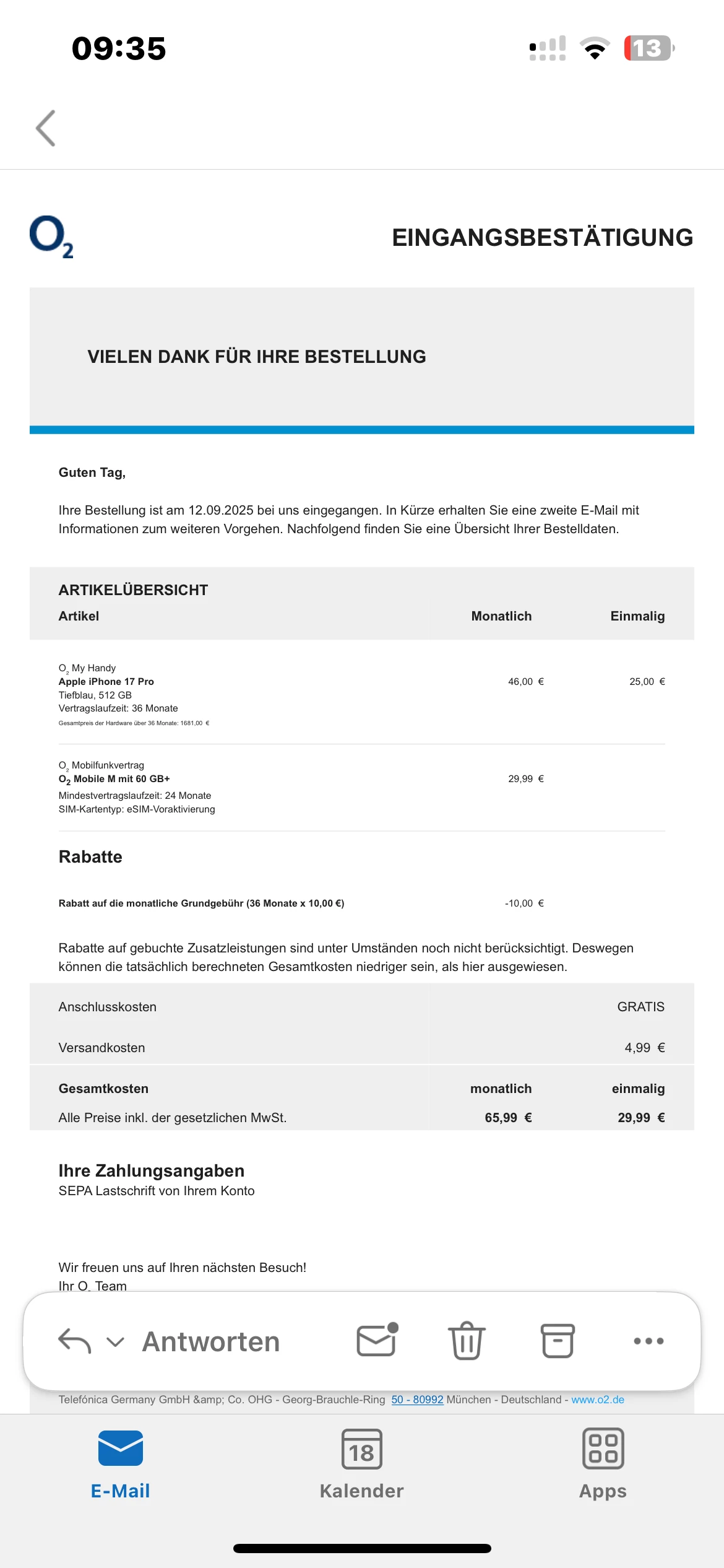 Bei dem gezeigten Screen handelt es sich nur um die Eingangsbestätigung und noch nicht die Vertrasbsestätigung.