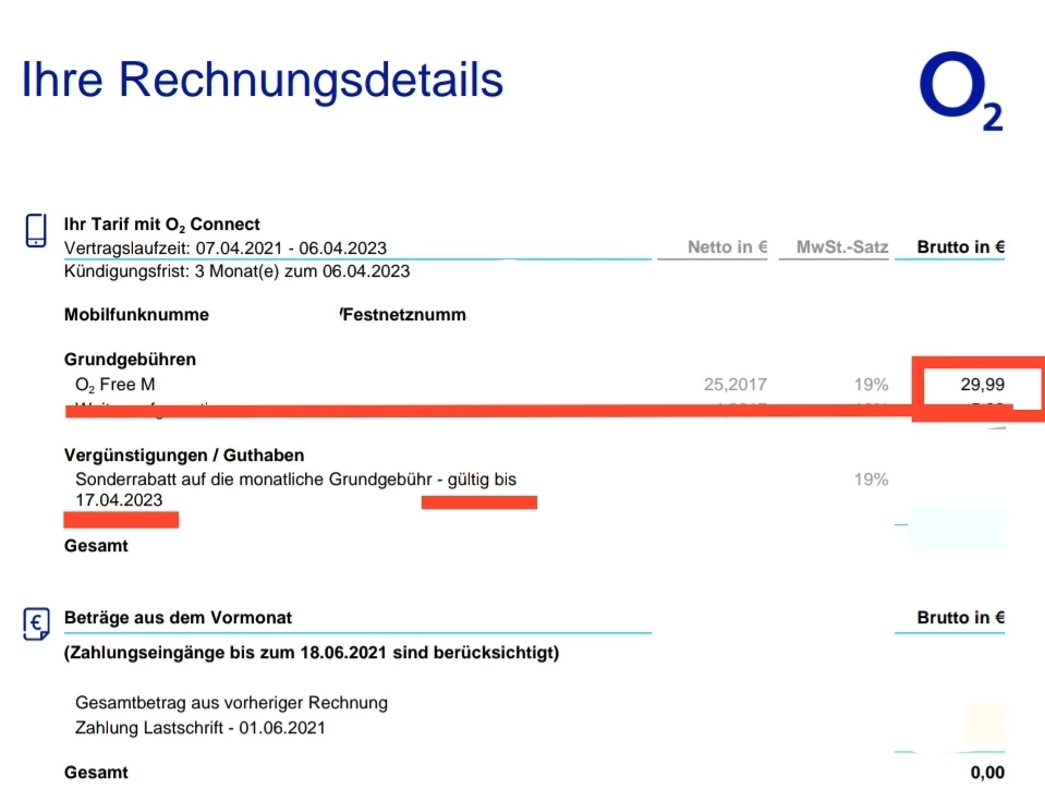 Auf jeder Rechnung wird jeden Monat an die Laufzeit, Laufzeit der Rabatte und die Kündigungsfrist erinnert.