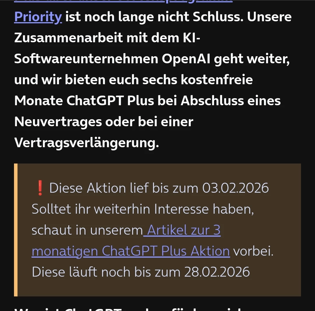Oh, das finde ich aber sehr komisch, weil in dem Angebot bei mir drin stand, dass es 6 Monate ChatGPT Gratis dazu gibt. Da bin ich aber auch gespannt jetzt - ich hoffe, es wurden mir nicht Konditionen versprochen… leider hatte ich mir keinen Screenshot gemacht, es war ein Angebot in der App, deswegen habe ich das auch angenommen. Leider sehe ich aber auch nirgendwo sonst die Kondition mit den 6 Monaten gratis ChatGPT mehr… ich hoffe wirklich, dass das nicht einfach nur dort in dem Angebot stand und jetzt nicht mehr gilt, das wäre wirklich gemein.