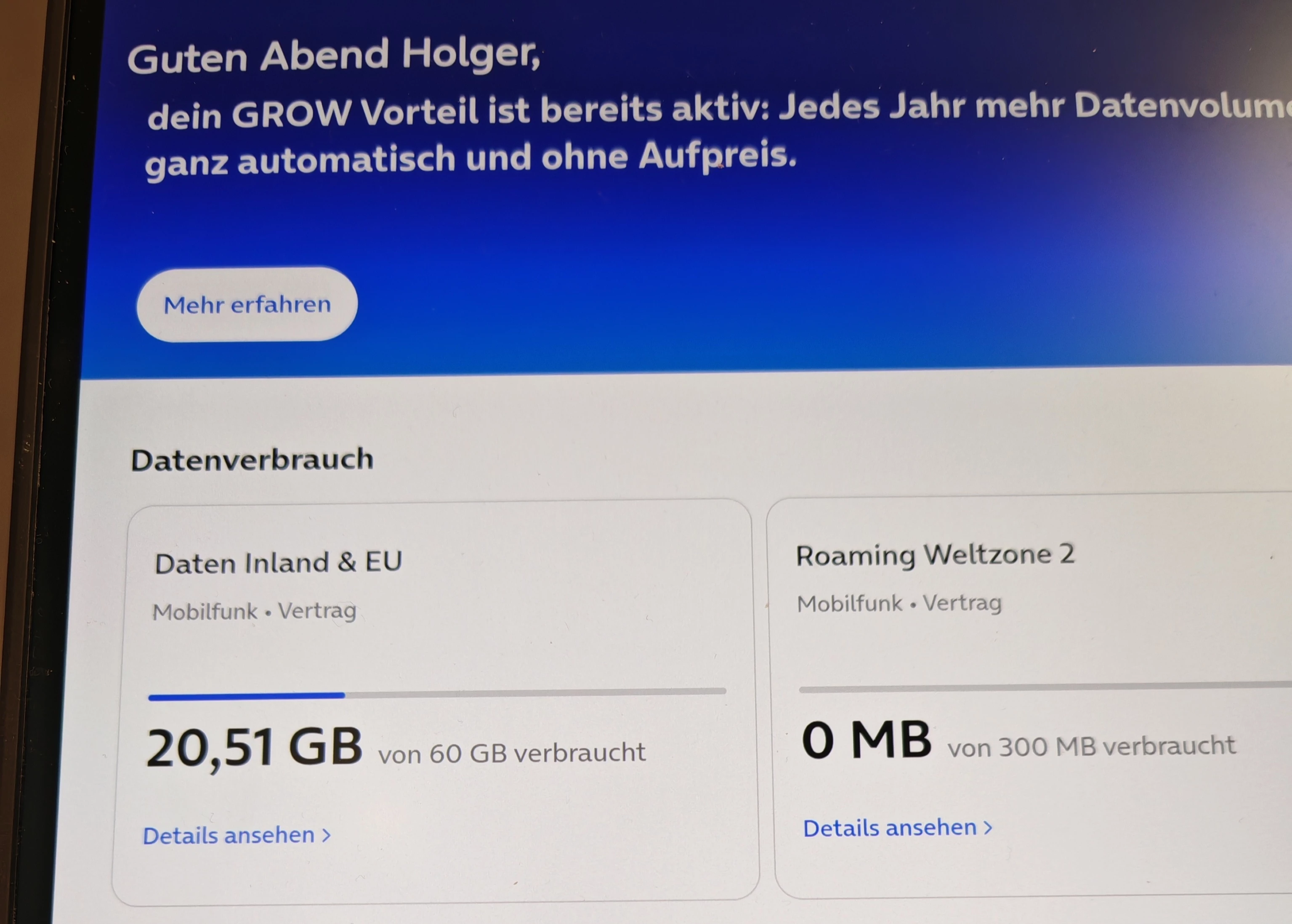 Hallo, obwohl ich Grow mit 60 GB habe, habe ich bei 80% von 20 GB und jetzt bei Überschreitung von 20GB diese Meldung bekommen: