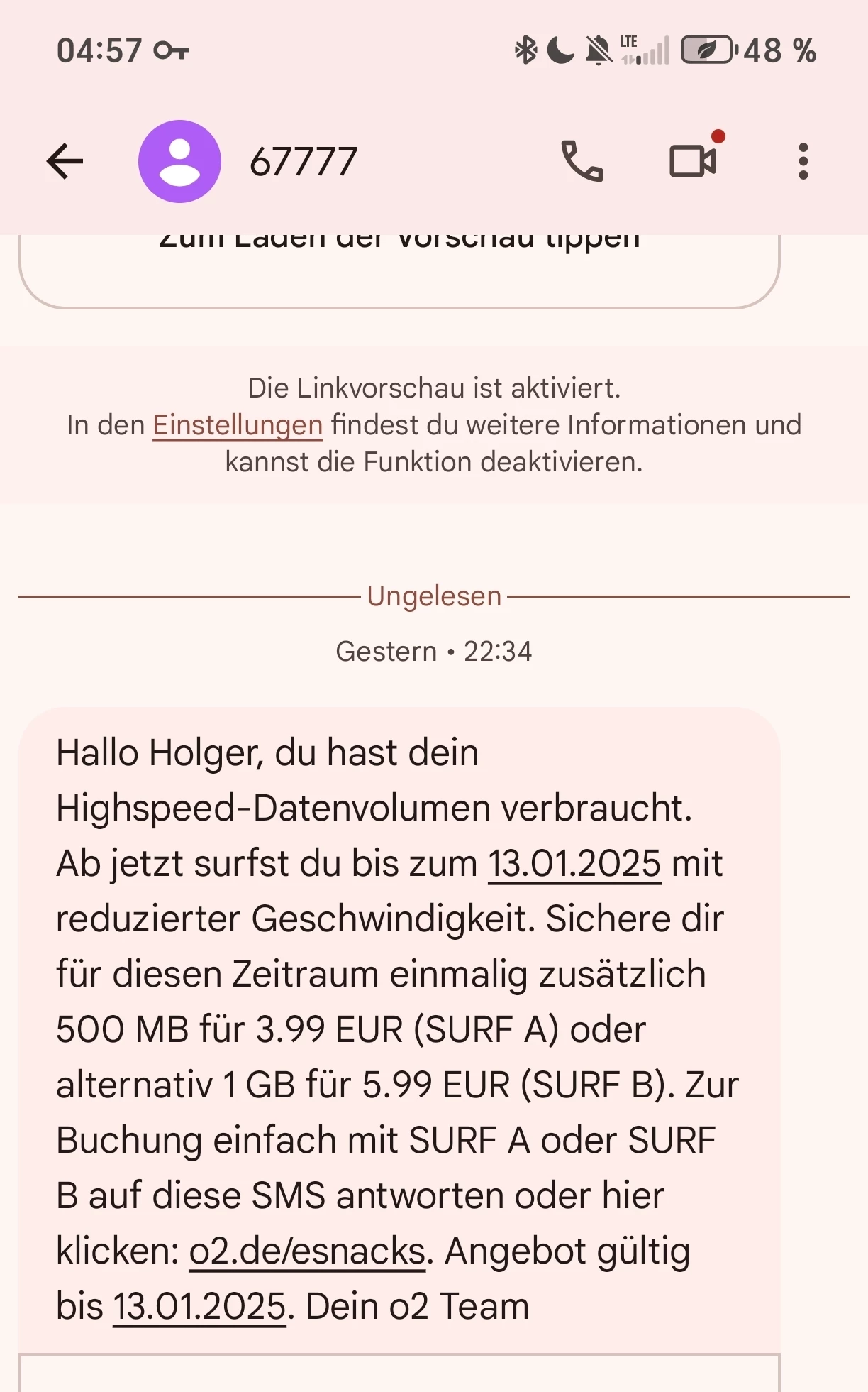 "hallo Holger, Du hast Dein Hightspeed.. verbraucht. Ab jetzt surfst Du bis zum 13.1.25 mit reduzierter Geschwindigkeit." Und ich soll jetzt Pakete dazu buchen.