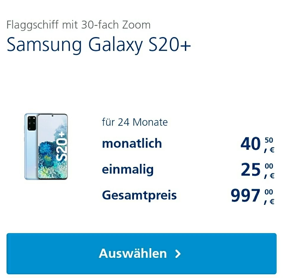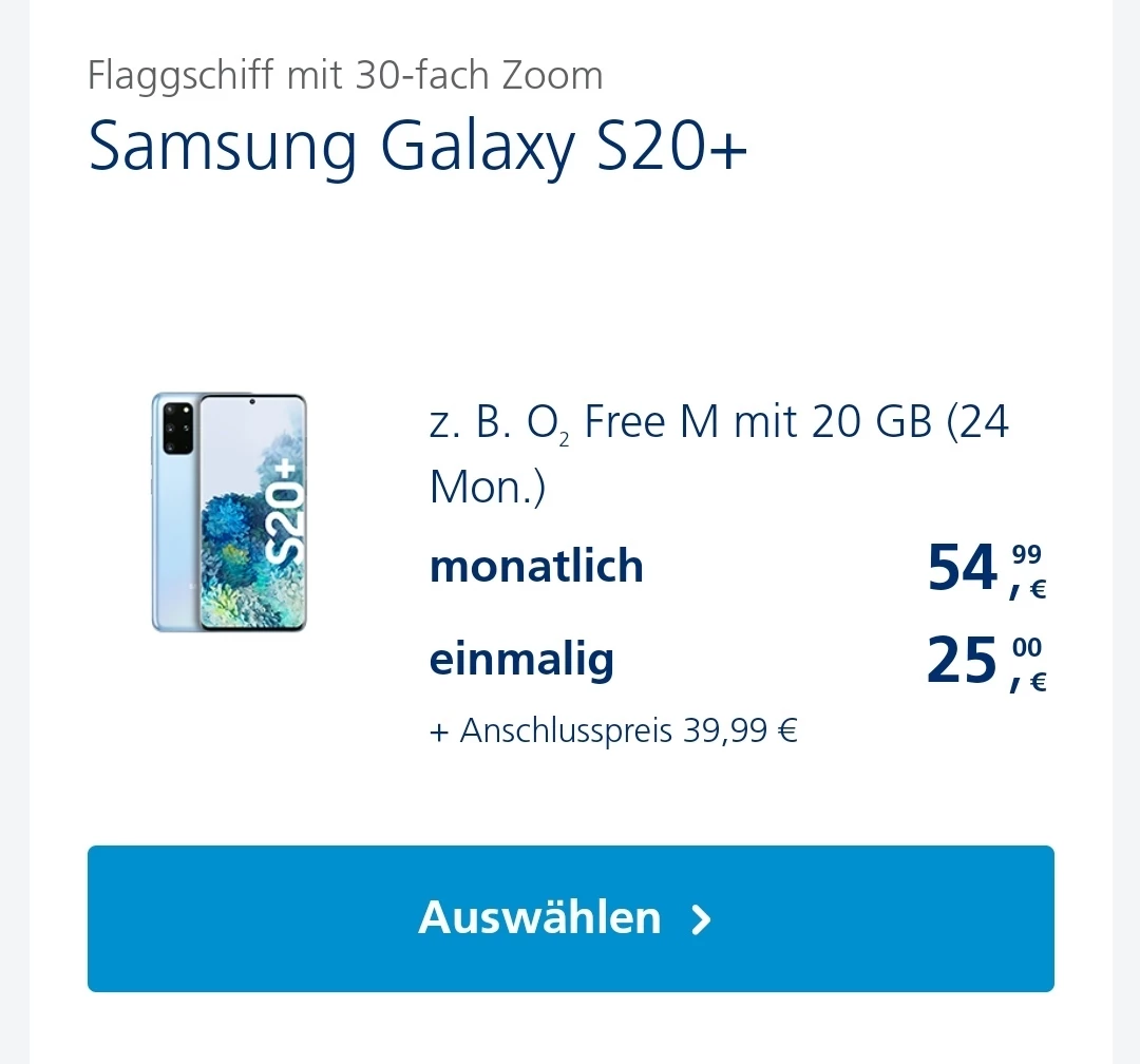 Schau mal unter die Kombi mit dem S20+ mit dem gewünschten Tarif zu Neukunden-Konditionen und rechne da ca 10€ drauf.
