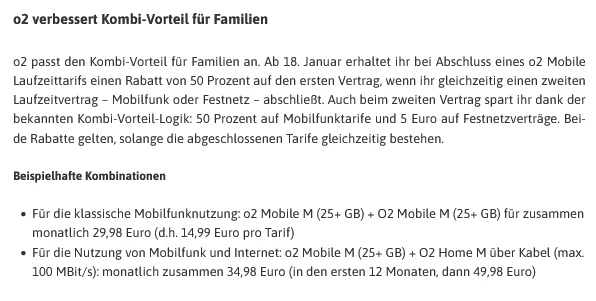 Naja, als “Verbesserung des Kombivorteils” würde ich die Aktion nun nicht betiteln … o2 will einfach neue Kunden haben und startet deshalb die Aktion, dass man bei gleichzeitigem Abschluss mehrerer Tarife schon auf den ersten Mobilfunktarif (gilt aber erst ab dem “Mobile M”) 50% Rabatt erhält (bin mal gespannt, wie o2 diesen Rabatt dann benennt und ob das dann auch alles klappt mit der Umsetzung in den Systemen).