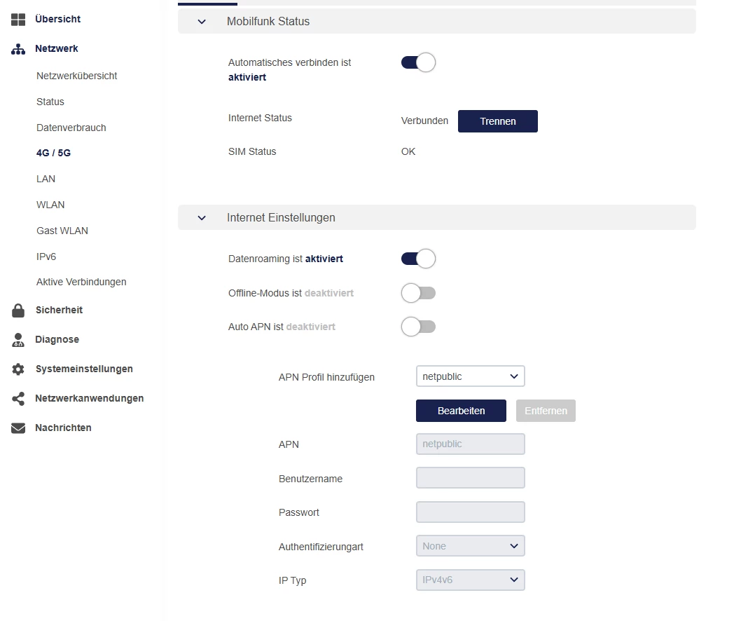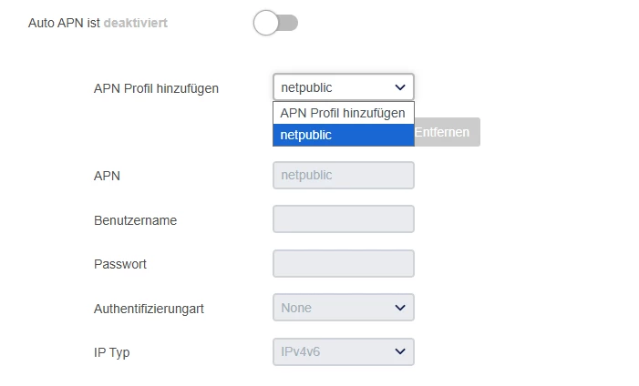 Die Einstellungen nach APN netpublic sind auch bestimmt nicht leer, sondern mit den Standardwerten belegt? Es ist nur ein separates Profil notwendig, das APN netpublic enthält.