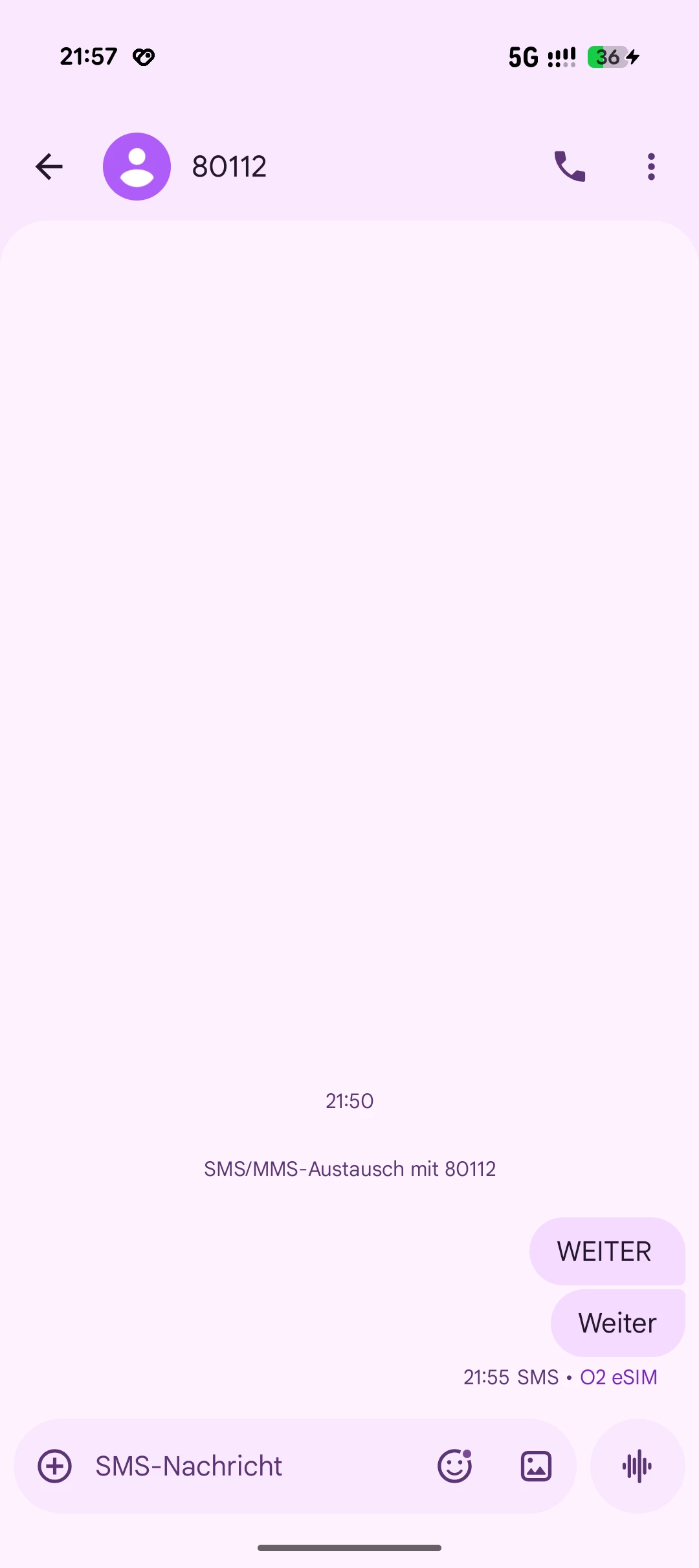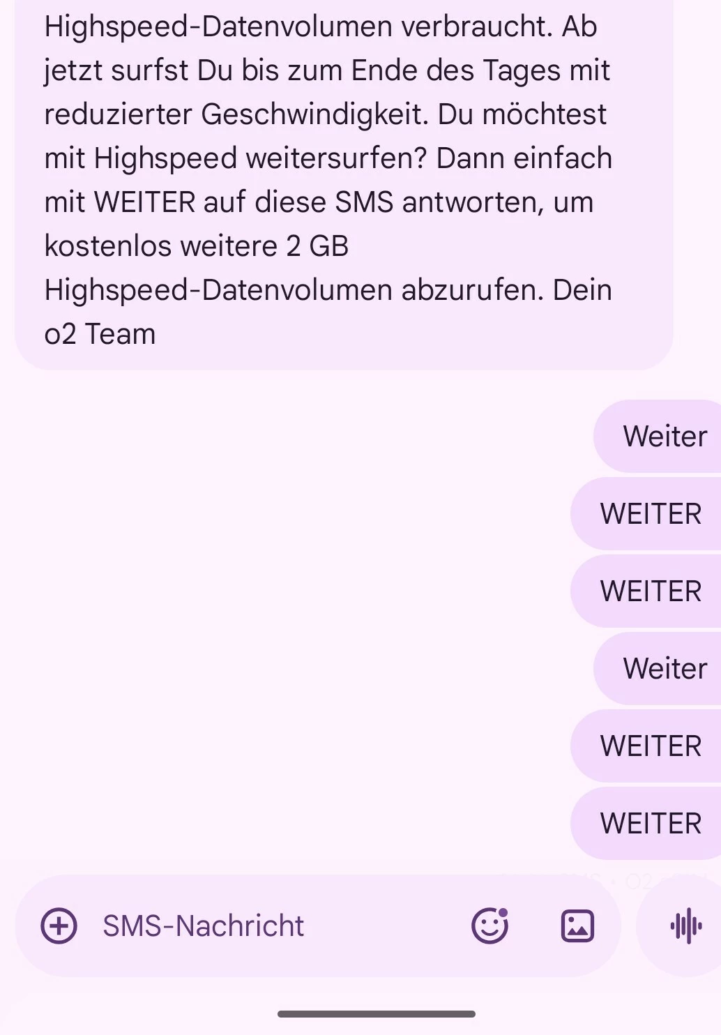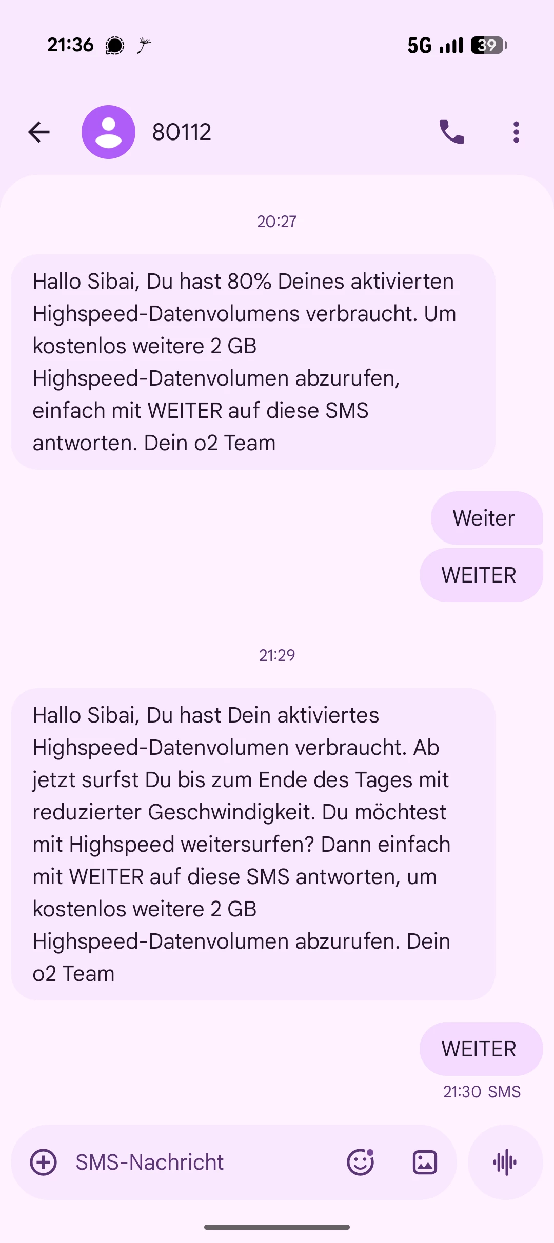 Hallo zusammen, bei mir funktioniert die Nachbuchung von 2 GB per SMS (WEITER) an 80112 nicht. Früher habe ich diese Funktion nur einmal in Anspruch genommen und es hat geklappt. Ich habe schon viel versucht, neue Konversation starten und an 80112 und +80112 zu schicken, auch habe ich probiert mit 3 anderen verschiedenen SMS-App. Leider bekomme ich keinerlei Antwort auf meine Nachrichten.