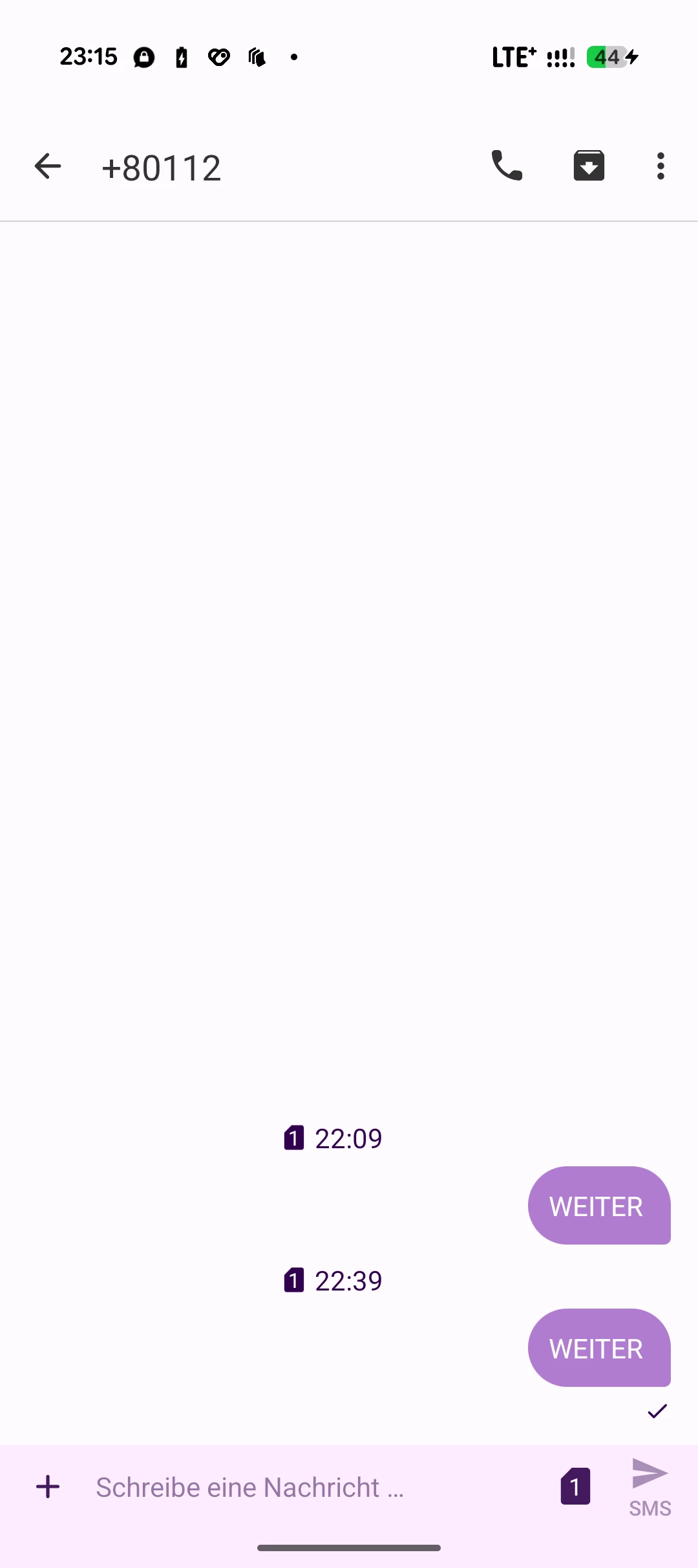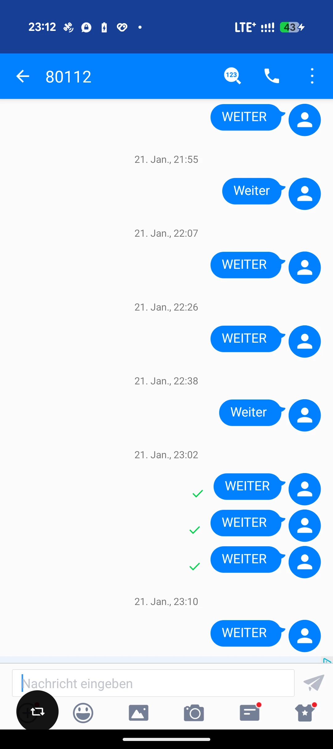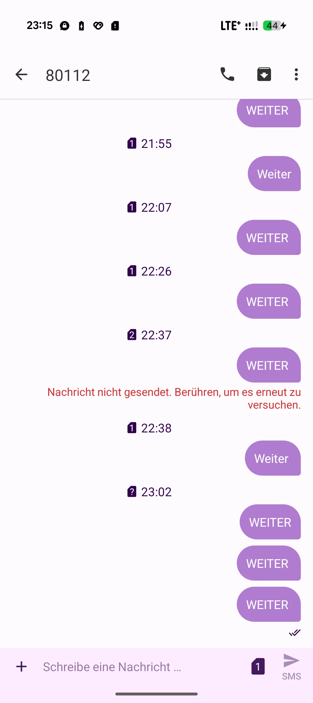 Hallo zusammen, bei mir funktioniert die Nachbuchung von 2 GB per SMS (WEITER) an 80112 nicht. Früher habe ich diese Funktion nur einmal in Anspruch genommen und es hat geklappt. Ich habe schon viel versucht, neue Konversation starten und an 80112 und +80112 zu schicken, auch habe ich probiert mit 3 anderen verschiedenen SMS-App. Leider bekomme ich keinerlei Antwort auf meine Nachrichten.