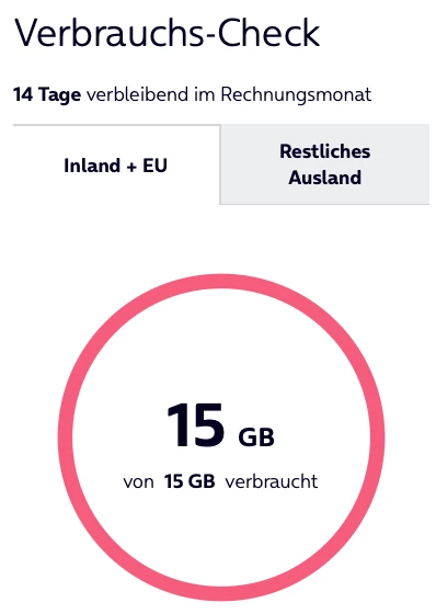 Heute SMS bekommen, dass das ganze Datenvolumen verbraucht ist. o2App sagt 15 GB von 35 GB verbraucht. Mich heute über den PC ins Portal eingeloggt, steht da 15 GB von 15 GB verbraucht.