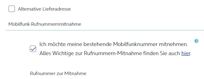 Während des Bestellprozesse in unserem Onlineshop kannst du direkt die Mitnahme der Rufnummer veranlassen, dazu hier ein Häkchen setzen: