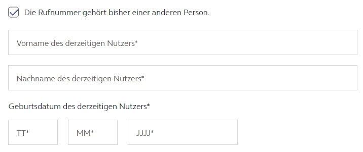 Ein wenig weiter unten gibt es den Punkt “Die Rufnummer gehört bisher einer anderen Person.”, hier ebenfalls ein Häkchen setzen und den Name sowie das Geburtsdatum deiner Frau eintragen: