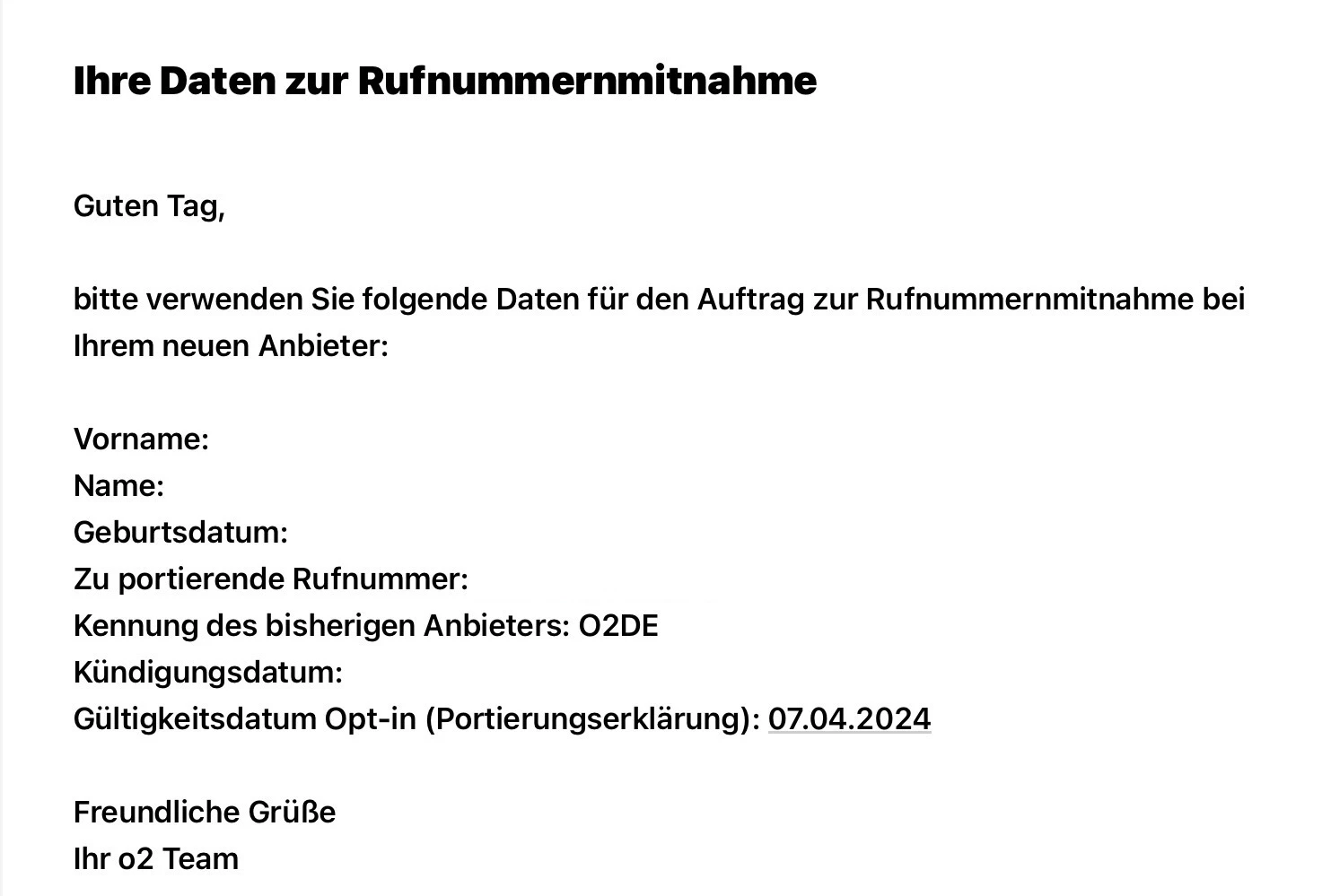 Du bekommst dann genau diese Bestätigung, die Bumer dir bereits gezeigt hat, mit den Daten für die Rufnummernmitnahme zu einem anderen Anbieter.