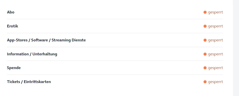 Nicht gesperrt sind: Abos und die Rubrik App-Stores, Software und Streaming-Dienste.
