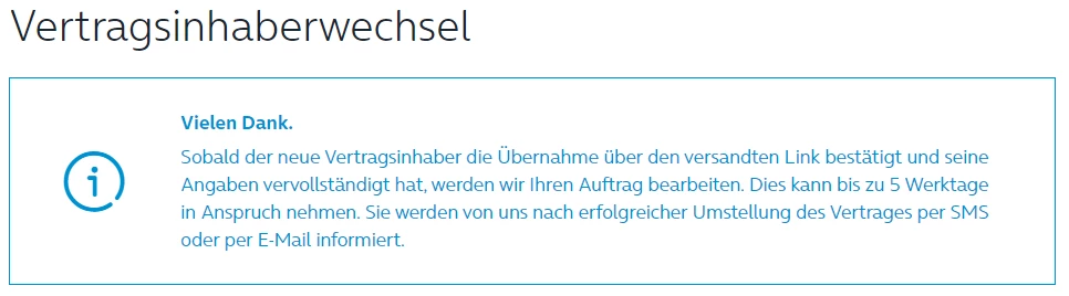 Wenn der neue Vertragspartner diese E-Mail bestätigt also das Angebot angenommen hat erfolgt im nächsten Schritt die Übernahme, und in der Regel erhält man am nächsten Tag dann eine E-Mail das der Vertrag übertragen wurde. Hört man danach gar nichts mehr ist das leider oft ein Hinweis darauf das der Vertrag nicht übertragen wurde. Denn in den meisten Fällen wird der aktuelle Vertragspartner über die Ablehnung nicht informiert, selbst der Vertragspartner der den Vertrag übernehmen wollte bekommt keine Ablehnung per E-Mail. Ich hab das jetzt schon in anderen Foren öfters gelesen.