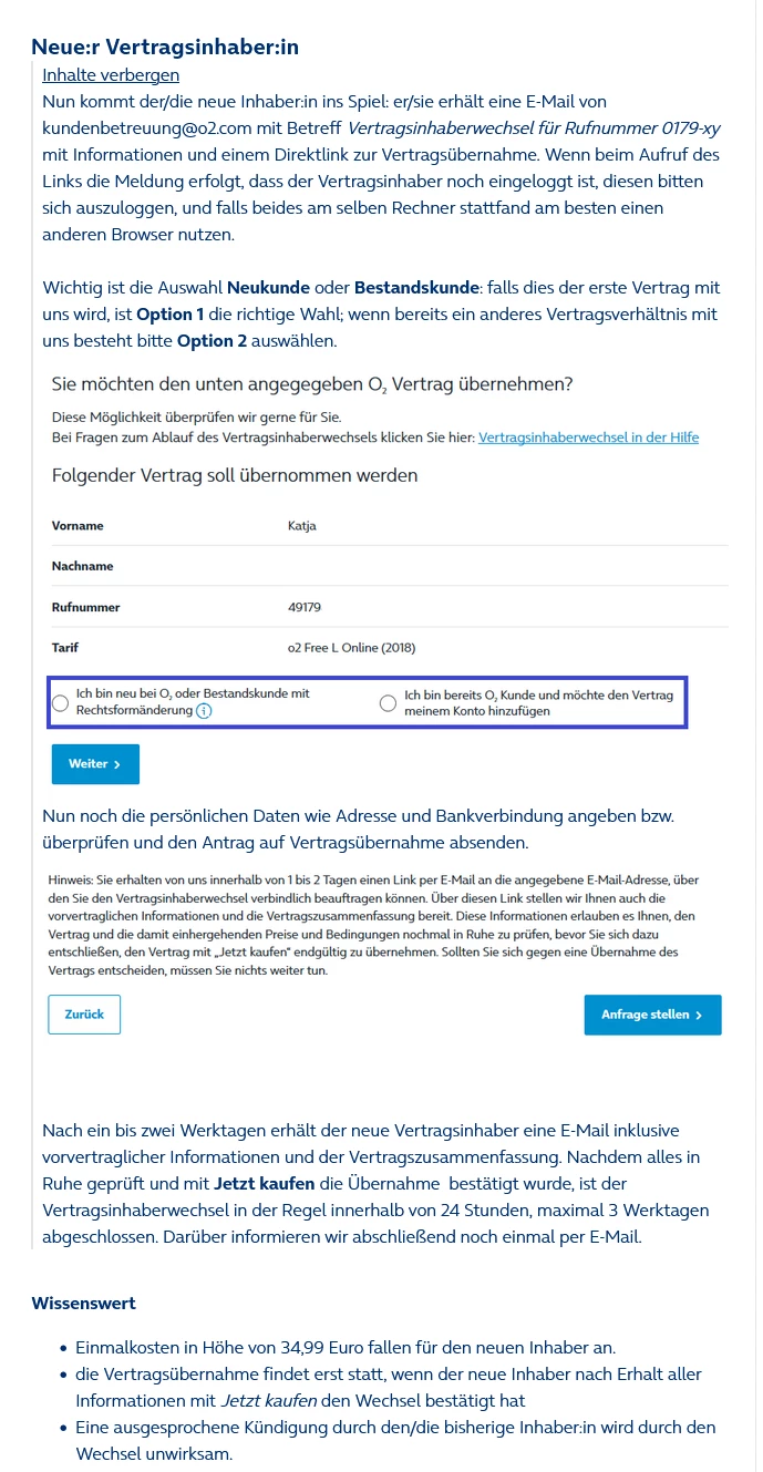 Bin im Browser auf o2.de und habe über Tarif & Sim die Kategorie Vertragsinhaberwechsel angeklickt, dort dann die E-Mail vom neuen Vertragsinhaber eingetragen. Kurze Zeit später hat der neue Vertragsinhaber eine Bestätigungsemail erhalten und danach kam nichts mehr. Das war am 06.01.23