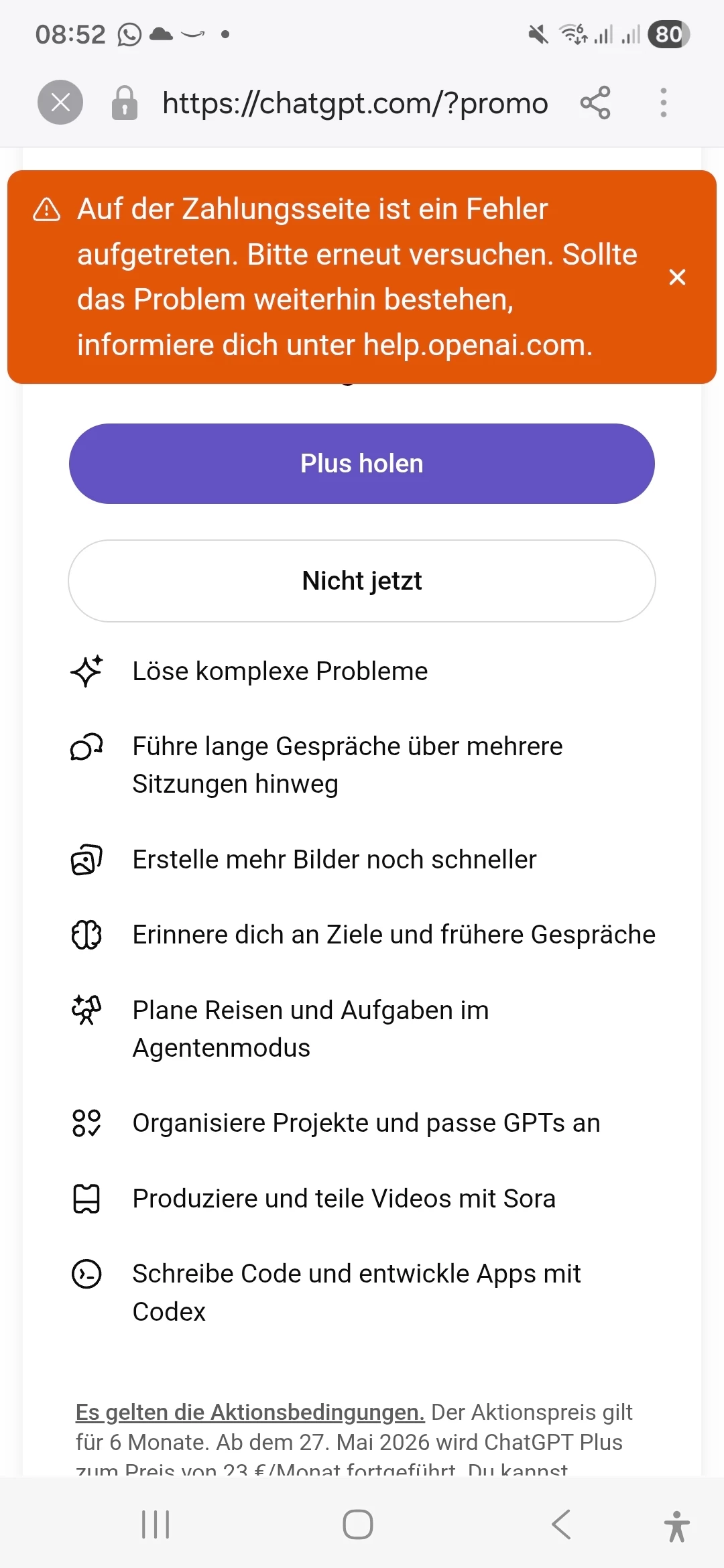 Wir kümmern uns um eine Lösung dafür, du bist auch nicht alleine damit, in unserem Artikel zu der 6 Monate Chat GPT-Aktion haben sich auch anderen  User gemeldet.