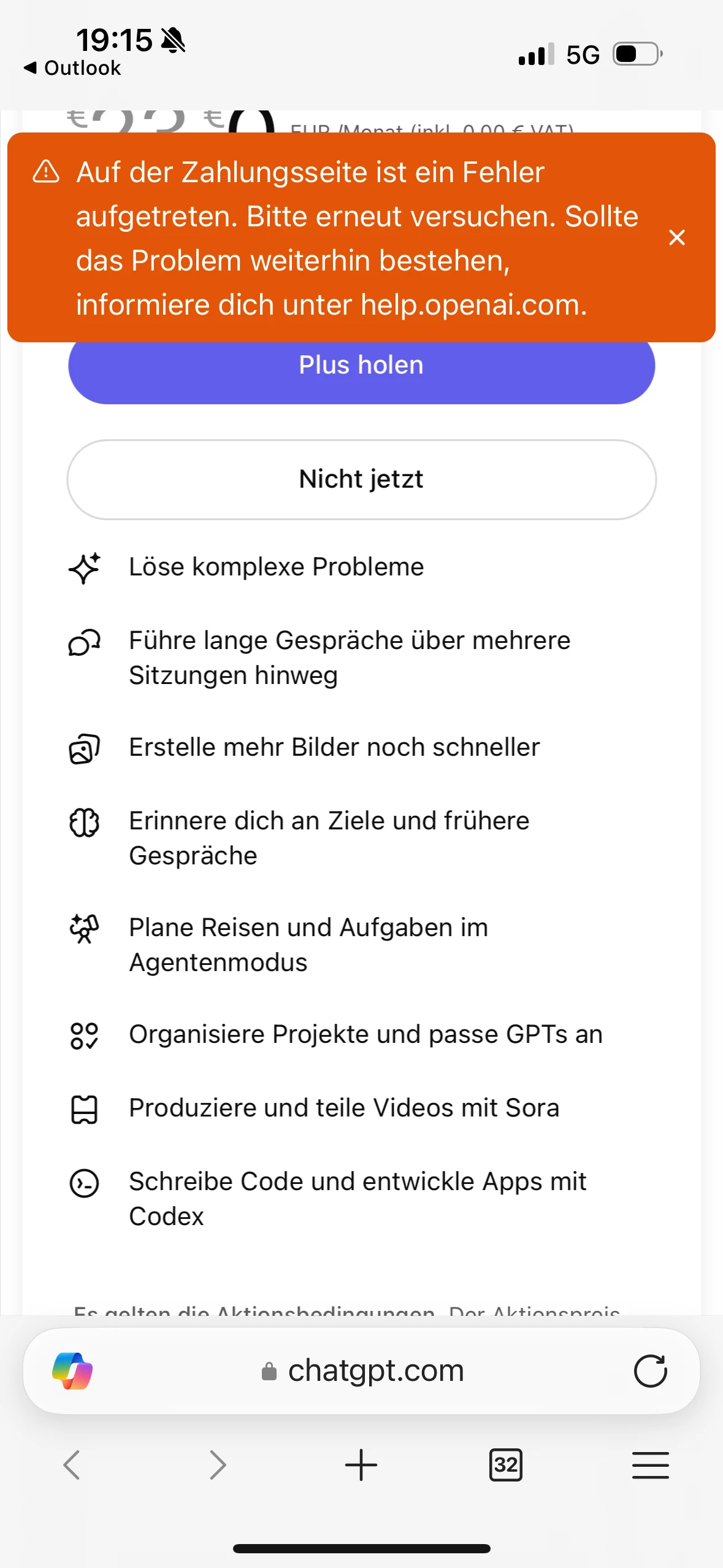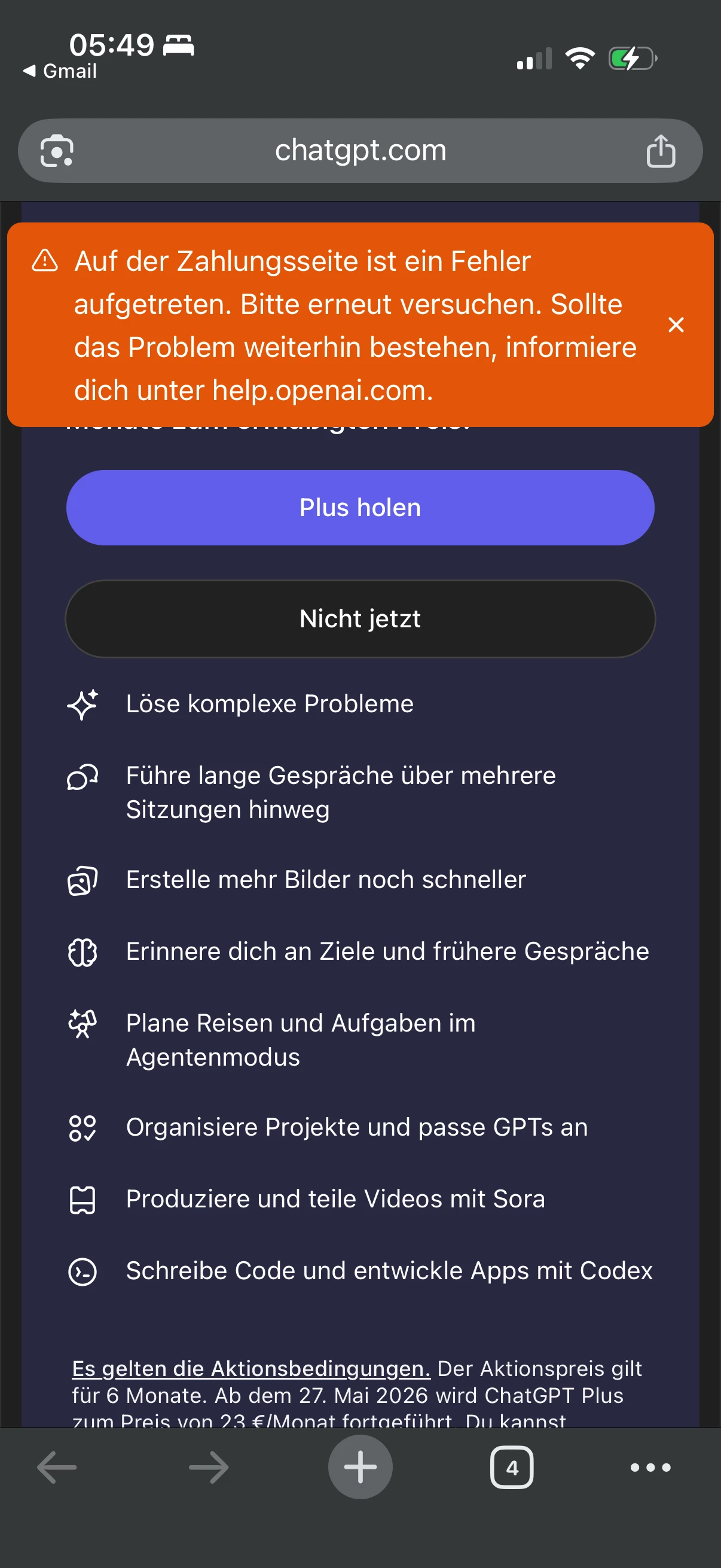 mehr weiß ich jetzt auch nicht. Ich bekomme immer dieselbe Meldung unzwar: • Auf der Zahlungsseite ist ein Fehler aufgetreten. Bitte erneut versuchen. Sollte das Problem weiterhin bestehen, informiere dich unter help.openai.com.