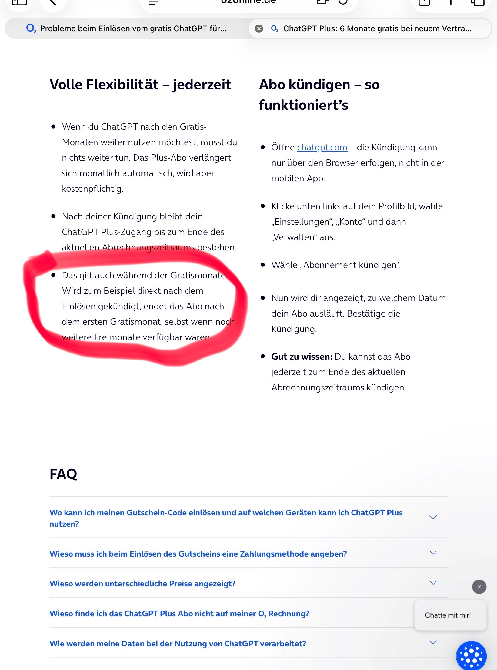 danke für deine Antwort. Ich verstehe, dass sich die Kündigung nicht einfach rückgängig machen lässt. Die Info auf der Website der Aktion habe ich schlicht nicht gelesen, da ich erwartet habe, dass sich alle relevanten Informationen bereits in der E-Mail befinden. Ich sehe ehrlich gesagt hier keinen Fehler meinerseits. Wie oben beschrieben, wird etwas ganz anderes in der Mail suggeriert. Das habe ich in meinem vorherigen Post schon beschrieben. Das siehst du doch sicher auch so, wenn du schon auf die nicht eindeutige Formulierung aus der Mail verweist. Ein Zeichen des guten Willens seitens 02 halte ich in dieser Situation für mehr als angebracht. Wenn sich der Rabatt nicht reaktivieren lässt, könnte man doch sicher mit einem Ersatzcode oder einer Gutschrift behilflich sein. Wie gesagt, ich habe den Vertrag maßgeblich deswegen abgeschlossen, da ich mir so ein halbes Jahr die ChatGPT+ Gebühr spare. Andernfalls hätte ich einen anderen (günstigeren) Telefonvertrag gebucht. Nur in Verbindung mit der Aktion hat es für mich Sinn ergeben. Ich nutze diesen Kommunikationskanal hier im Forum, da meine Mail an 02 zehn Tage unbeantwortet blieb und nicht auf mein Anliegen einging sonder mir nur mitgeteilt wurde, wie man das ChatGPT+ Abo kündigt. Danach hatte ich ja gar nicht gefragt. Ich bin sehr enttäuscht.