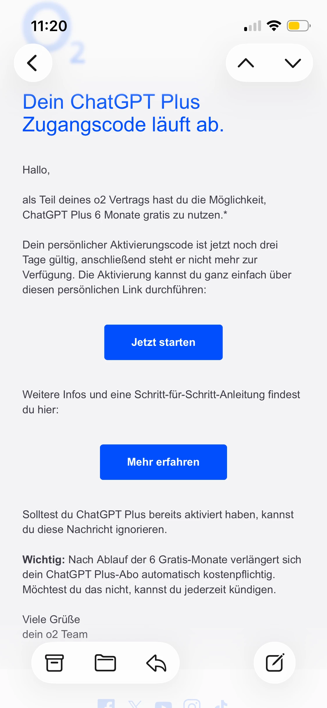 Ich hatte ja 2 Codes für 6 Monate, die ich aktivieren konnte, und zudem einen durch O2 Priority, der 3 Monate gültig ist. Den habe ich eben eingelöst. Soeben habe ich von ChatGPT für beide Accounts folgende Nachricht erhalten: