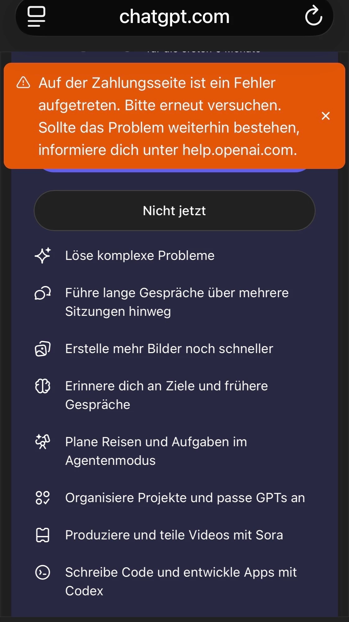 ich habe leider das gleiche Problem. Egal ob mit iPad, iPhone, Computer oder Android bekomme ich die gleiche Fehlermeldung. Auch das nutzen eines anderen Kontos oder der Erstellung vom neuen Konto. Die FAQS von ChatGpt haben leider auch nicht geholfen.