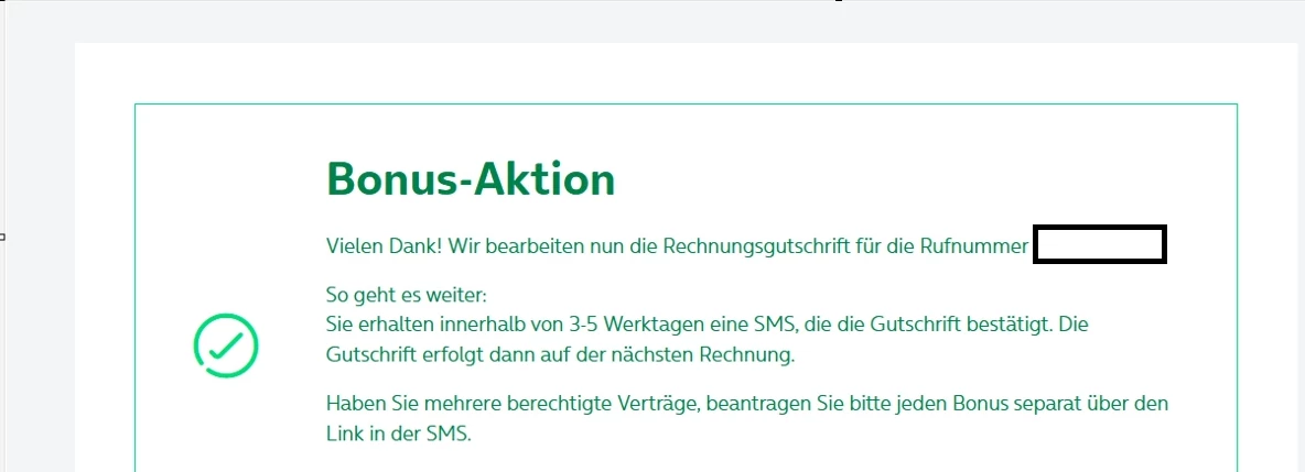 Leider habe ich nicht wie angegeben, innerhalb von 3-5 Werktagen eine SMS erhalten, die die Gutschrift bestätigt. Die Gutschrift erfolgt dann auf der nächsten Rechnung.