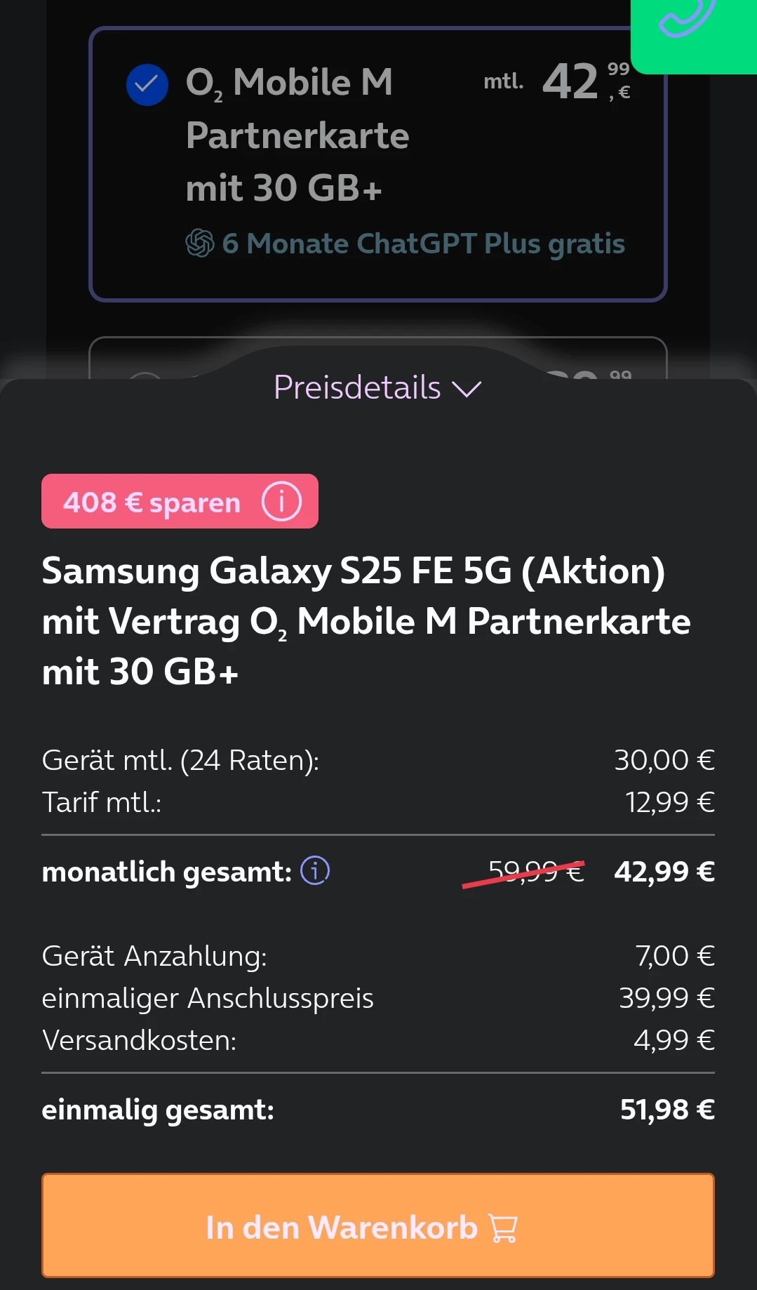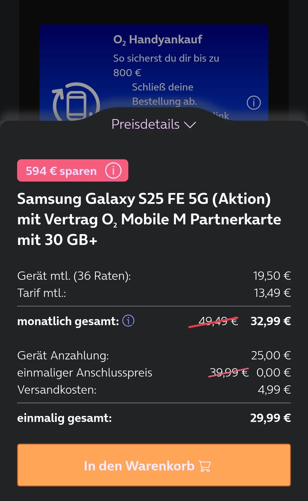 Ob ich beim Angebot Galaxy S25 FE mit o2 Mobile M (2× Handy + Tarif) zusammen mit meinem aktuellen DSL-Vertrag o2 Home M 100, für den ich monatlich 35,48 € zahle, insgesamt bei 115,46 € monatlich bleibe oder ob noch Kombivorteile angerechnet werden können, ist mir nicht ganz klar.