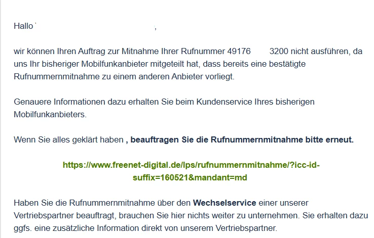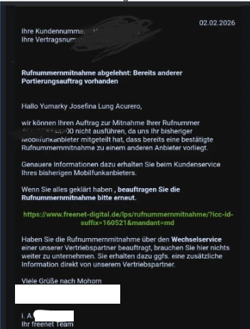 Hallo ​@Yumy Lung, vielen Dank für deine Nachricht. 🙂 Ich kann verstehen, dass die Nachricht dich verwirrt hat, wenn dir keine andere Portierungsanfrage für die betroffene Rufnummer bekannt ist. Es lag tatsächlich eine vor vom November 2025. Diese wurde allerdings nun gelöscht und Freenet kann jetzt eine neue Portierungsanfrage zuschicken. Diesmal sollte es klappen. 😌 Beachte nur, dass bei dem Auftrag die Daten mit denen aus dem Datenblatt, die du nach der Freigabe der Rufnummer von uns bekommen hast, eins zu eins übereinstimmen. Bei Unstimmigkeiten wir nämlich erneut abgelehnt.