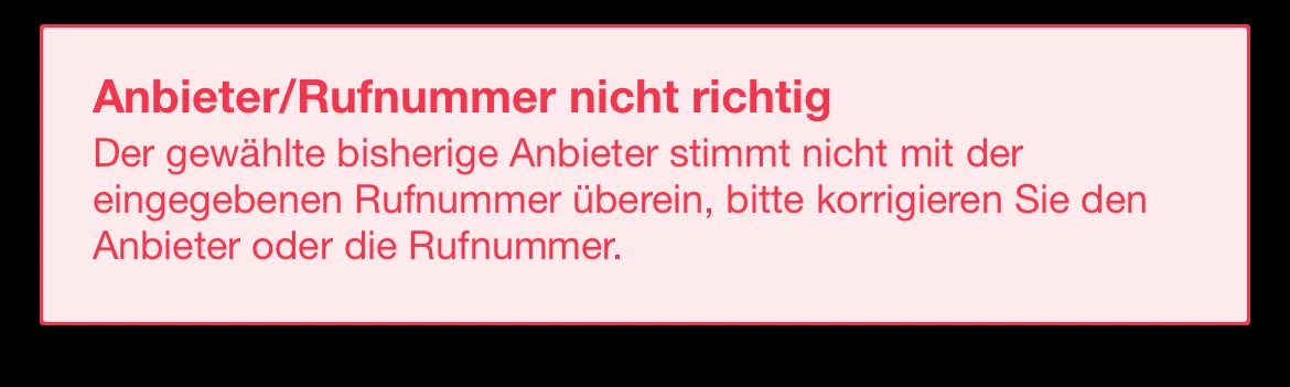 Wenn ich in App Rufnummermitnahme beantragen möchte, zeigt das app Anbieter und nummer passt nicht.