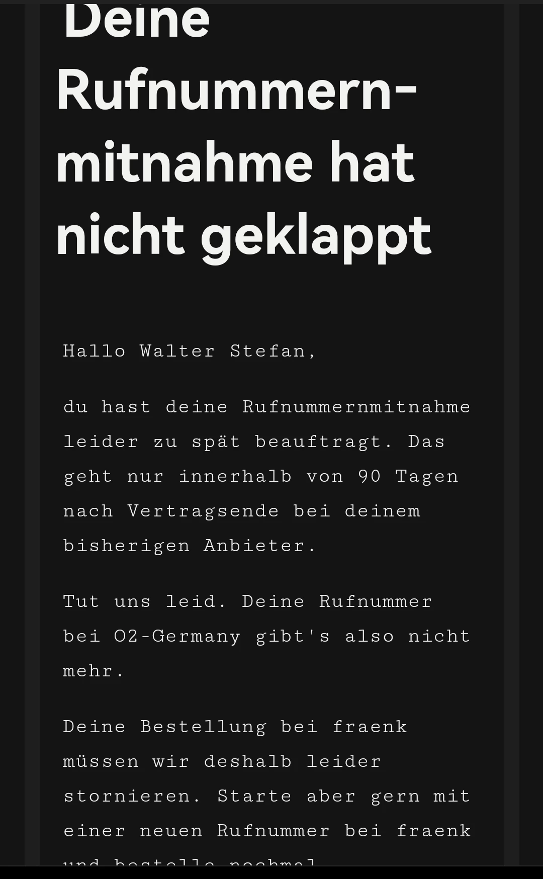 "du hast deine Rufnummernmitnahme leider zu spät beauftragt. Das geht nur innerhalb von 90 Tagen nach Vertragsende bei deinem bisherigen Anbieter.
