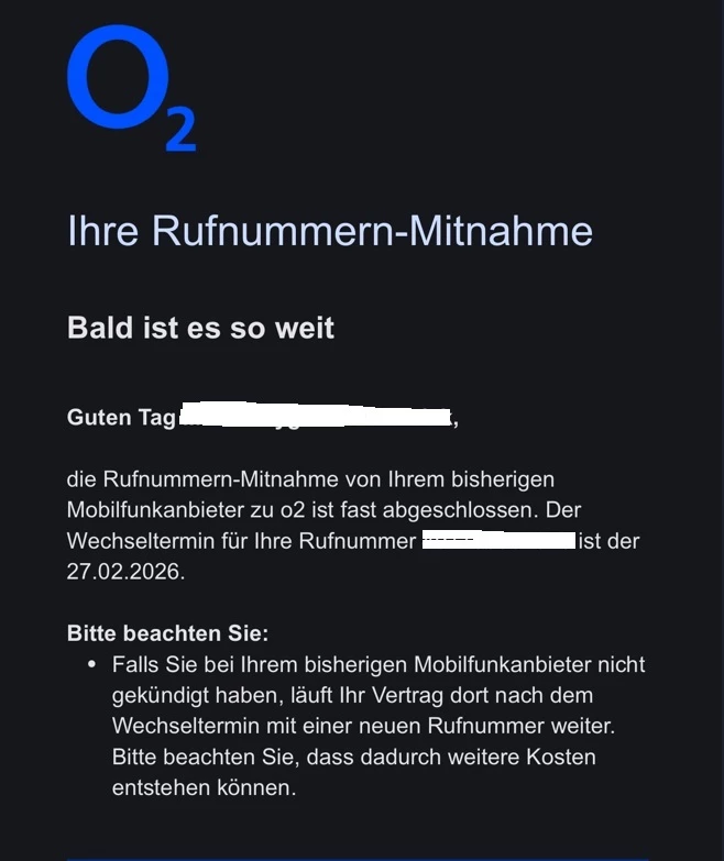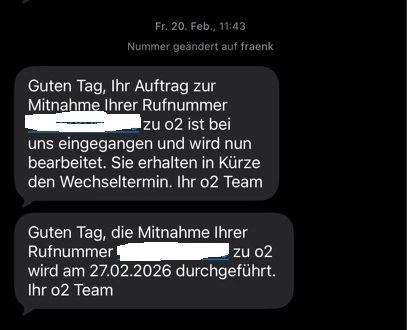 Die Portierung war zunächst auf den 27.02.2026 terminiert und wurde dann auf den 11.03.2026 verscheoben.