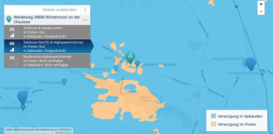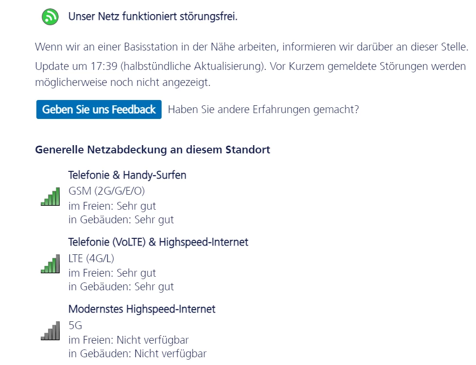 Es ist aber alles andere als sehr gut. Mit Glück kann ich zu Hause mal telefonieren, oft ist die Verbindung nicht da oder sehr schlecht. Die Datenverbindung ist oft so schlecht, dass nicht mal einfache WhatsApp Textnachrichten raus gehen. Zu Hause schlecht, unterwegs oft auch nicht viel besser. Ich lebe auf dem Dorf, in der nächsten Stadt 29640 ist es aber auch nicht gut. Und vor allem (was ich in 2022 erwarten würde) auch nicht konstant gut.