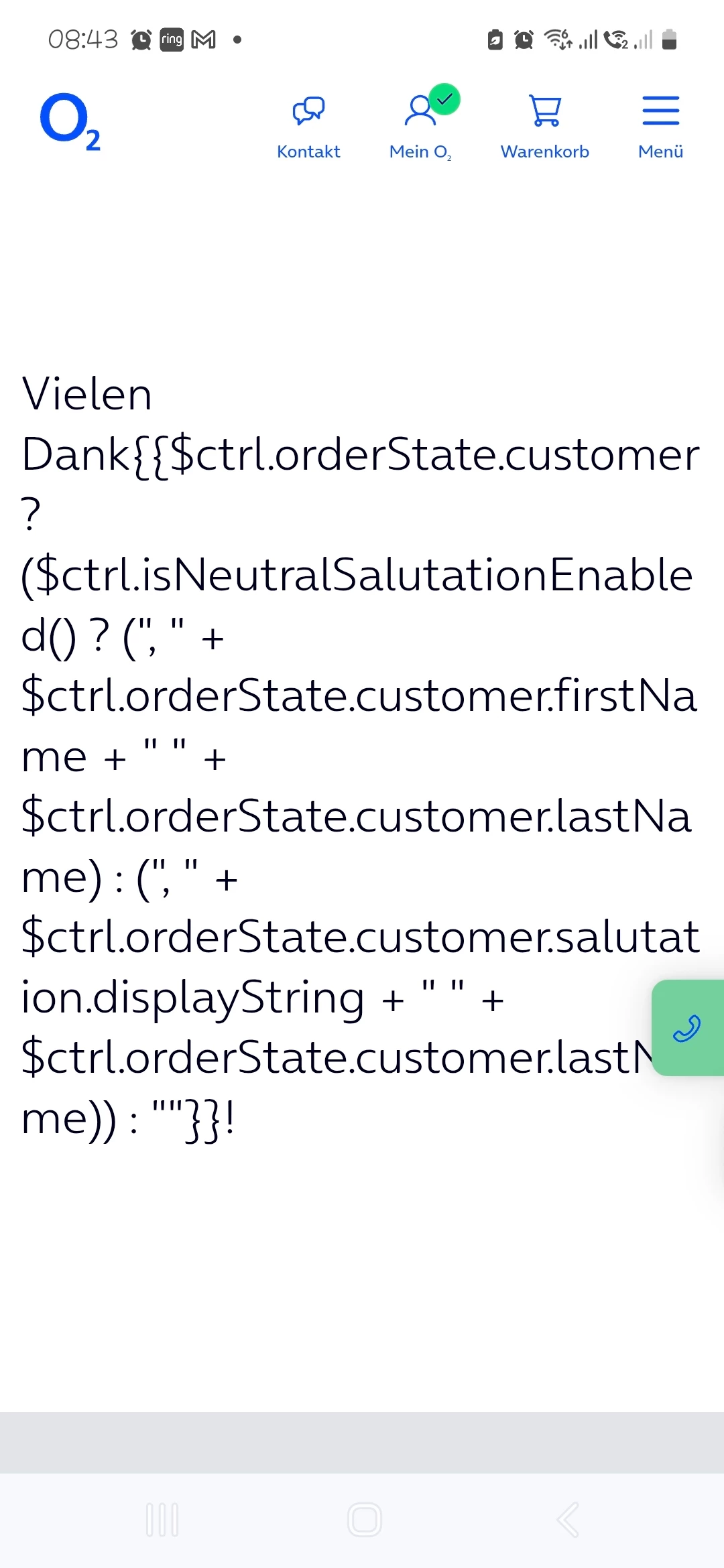 Hallo O2, ihr versendet gerade statt eines Bestätigungstextes Programmiercode, wenn Kunden an der aktuellen Aktion teilnehmen. Habe gerade ei Telefon bestellt und habe dann via Browser euren Code auf eurer Seite lesen können. I h habe einen Screenshot.