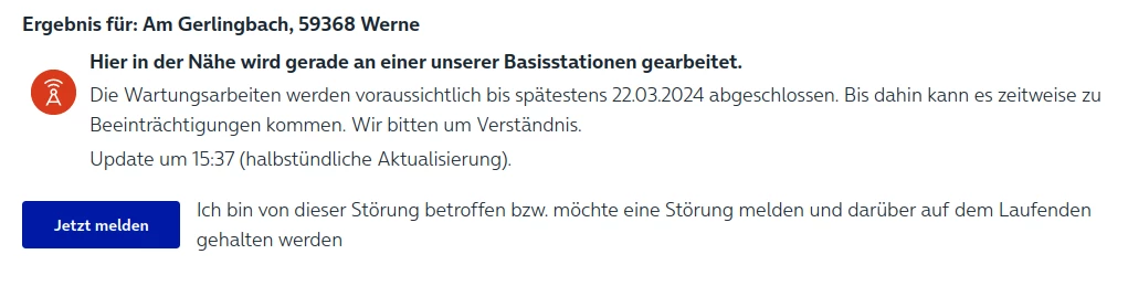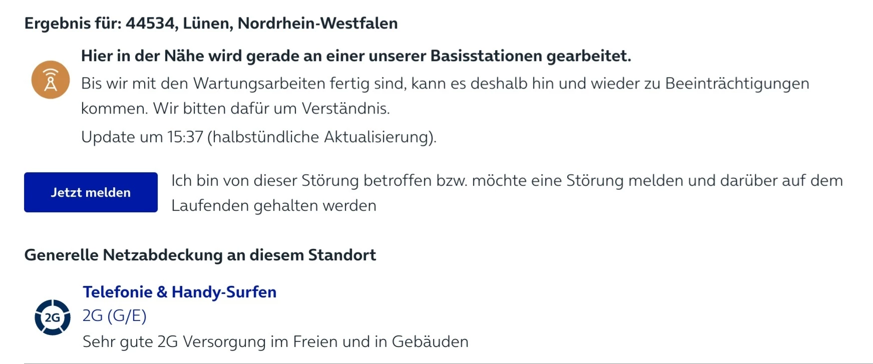 ich habe nun Informationen zur Lage in 44534 Lünen erhalten. In der Umgebung wurde eine Station abgebaut, was zu einem Komplettausfall führt. Das sind keine guten Nachrichten, und ich kann nur nochmals die Unannehmlichkeiten entschuldigen. Ich habe nochmals 2 Störungsmeldungen für beide Rufnummern gemacht, damit es korrekt dokumentiert ist.
