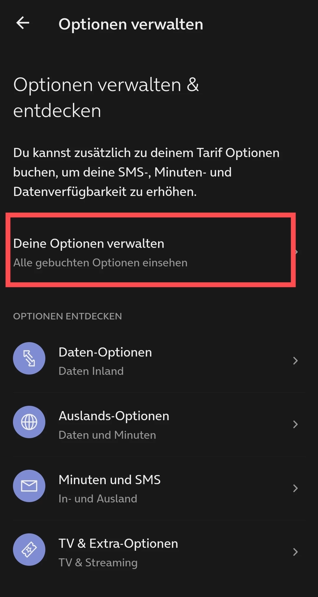 Vertrag verwalten → alle Optionen verwalten → deine Optionen verwalten → gebuchte Optionen einsehen