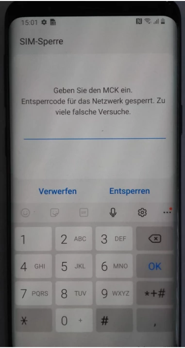 In letzter Verzweiflung habe ich dann einen Handy-Entsperrcode auf einer freundlichen Handy-Entsperren  (24) Webseite für 15,99 EUR bestellt.  Ich schreibe den Link zur Webseite im nächsten Post. Keine Ahnung ob der hier angezeigt werden wird. Nach 24h hatte ich den Netzentsperrcode NCK und den dazu passenden MCK  (den ich ja schon hatte) per Mail zugesandt bekommen.  Eingegeben, entsperrt, fertig.