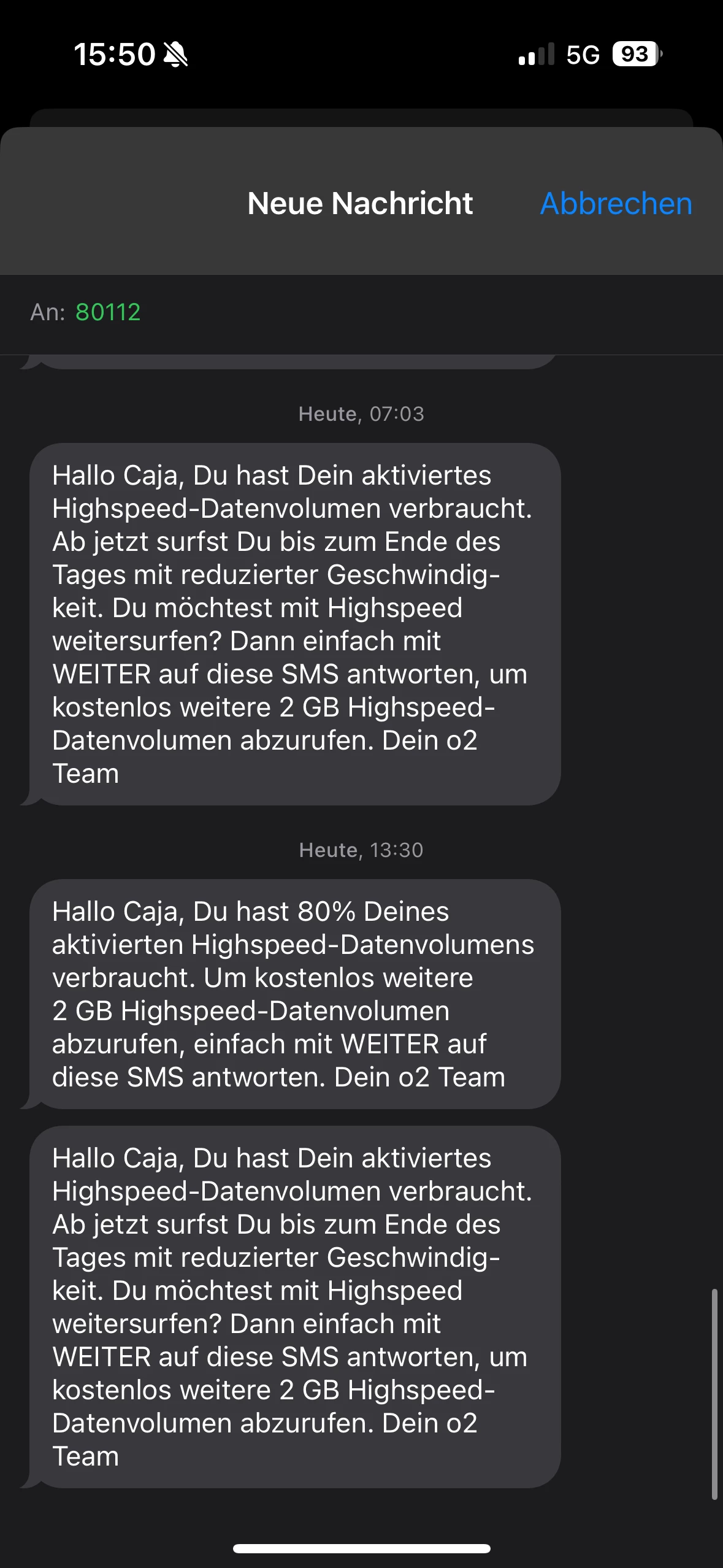 Hallo, ich habe den ‚Unlimited on Demand‘-Tarif und kann keine SMS mehr an 80112 senden, um neue GB zu buchen. Auch über die App finde ich keinen Button zum Nachbuchen. Bitte um Hilfe.