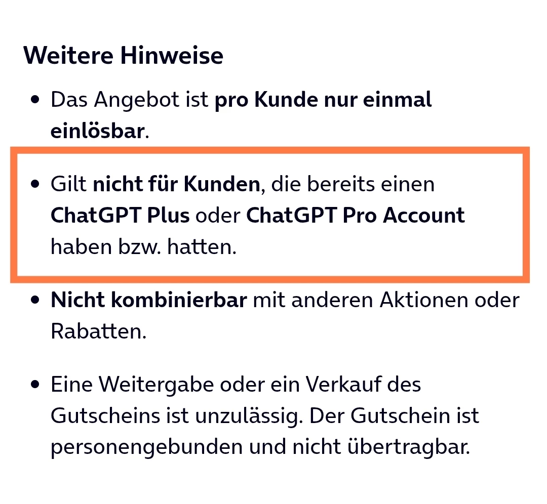 In meiner vertragszusammenfassung steht garnichts davon drin. Und warum da nichts drin steht habe ich auch im Gespräch nachgefragt daraufhin wurde gesagt das mit chatgpt kommt erst im laufe der nächsten Tage. Und dann kam nur der Link, der Link hat nicht funktioniert und mir wurde dann gesagt es wird ein neuer verschickt, dann war die Frist vorbei. Sieht so ein qualitativer Verlauf und Kundenservice aus?