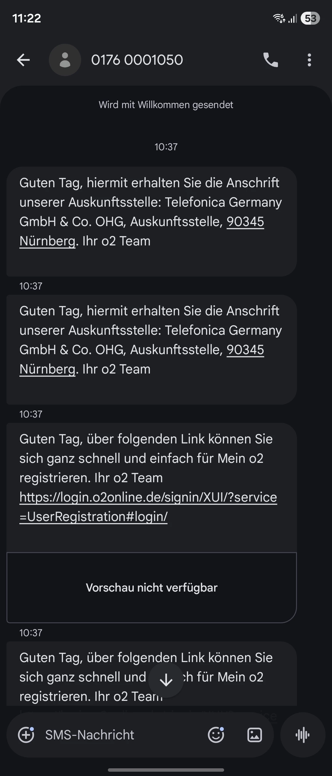 Hallo zusammen ich bin neu hier und würde gerne mal eine Frage bezüglich dieser SMS stellen. Ich hatte Kontakt mit einer Beraterin am Telefon die nicht so gut Deustch konnte. Sie konnte mir bei meinem Problem garnicht weiterhelfen. Daraufhin ist die Verbindung im Gespräch unterbrochen worden oder sie hat aufgelegt. Daraufhin habe an der Zahl 15 SMS erhalten, davon 14 innerhalb von 5 minuten von 10:37-10:42 von der O2 Hotline nummer 01760001050. Deren Inhalt ist unterschiedlich von neuen Bestellungen bis IBAN Nummer wo ich Zahlungen machen soll und Kotanktformularen. Ich möchte das dies nachverfolgt wird wieso weshalb diese ganzen Nachrichten verschickt worden sind. Es kann doch nicht sein das ein ausgezeichnetes Serviceteam sich beleidigt fühlt weil die Verbindung unterbrochen wird und dann den langjährigen Kunden mit Nachrichten zumüllt.