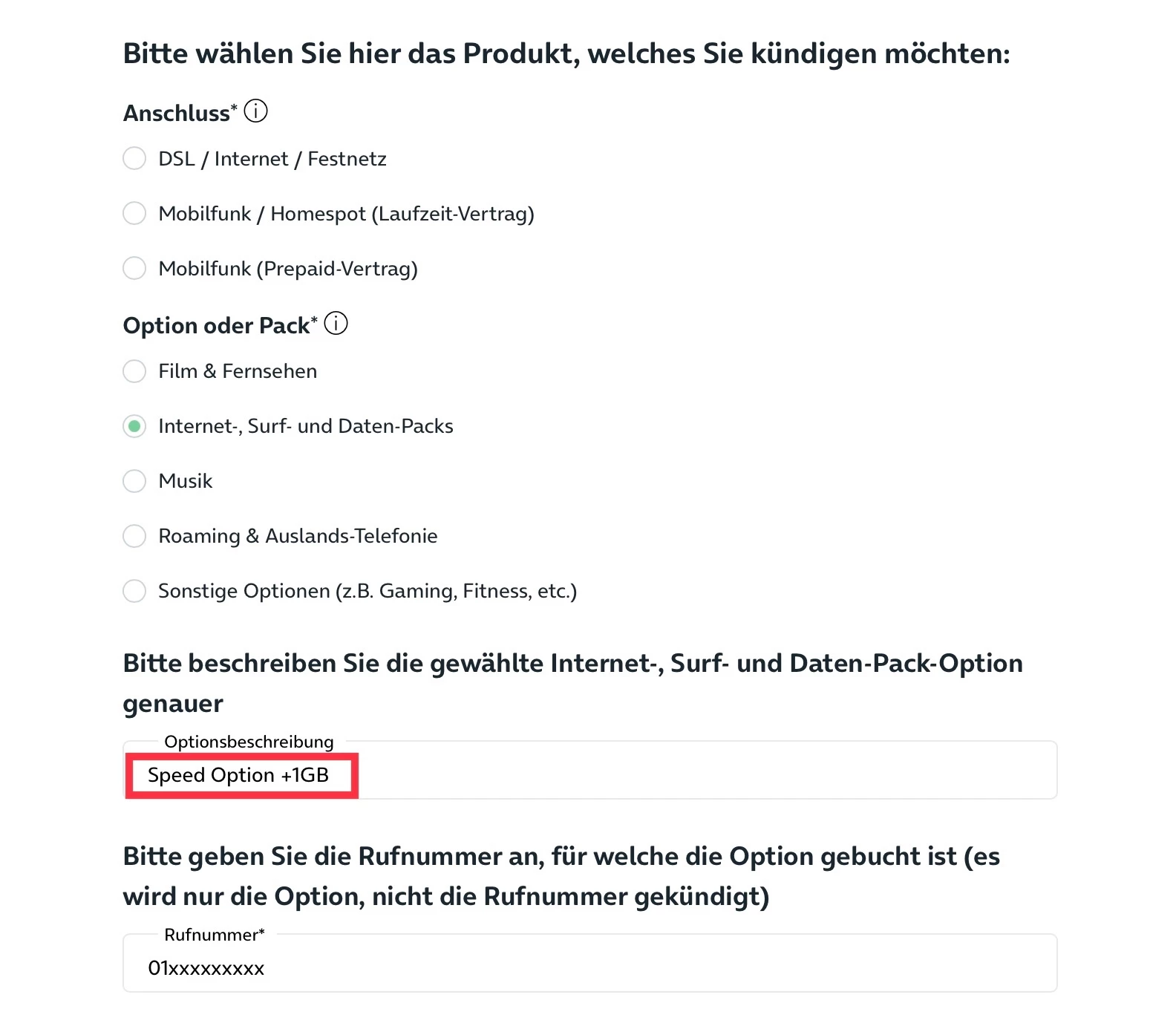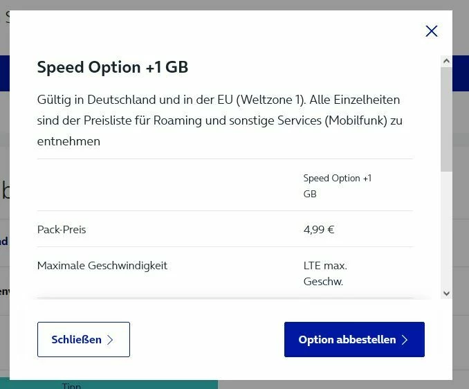 mehrmals habe ich versucht die Speed Option +1 GB abzubestellen, aber es funktioniert nicht.