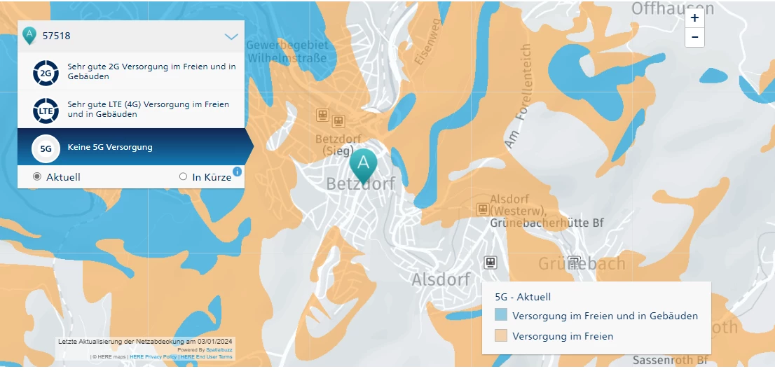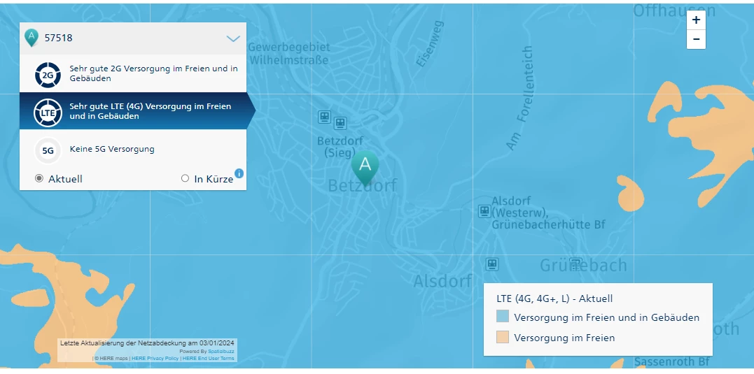 Ja, schaut man sich die Netzabdeckung dort an, dann können wir auch weiterhin sagen, dass dort der Netzausbau noch weitergehen sollte. Zumindest im Umkreis von Betzdorf und Siegen stehen bereits Termine zur Verfügung. Die werden nun zwar nicht den jeweiligen Ortskern abdecken und vermutlich auch erstmal nur dafür sorgen, dass hauptsächlich an anderer Stelle eine bessere Versorgung herrschen wird. Es zeigt aber auch, dass diese Bereiche weiterhin Beachtung finden, auch wenn man nach längerer Zeit einer Netzflaute das nicht immer wirklich glauben mag, weil einfach nichts an der eigenen Adresse passiert.