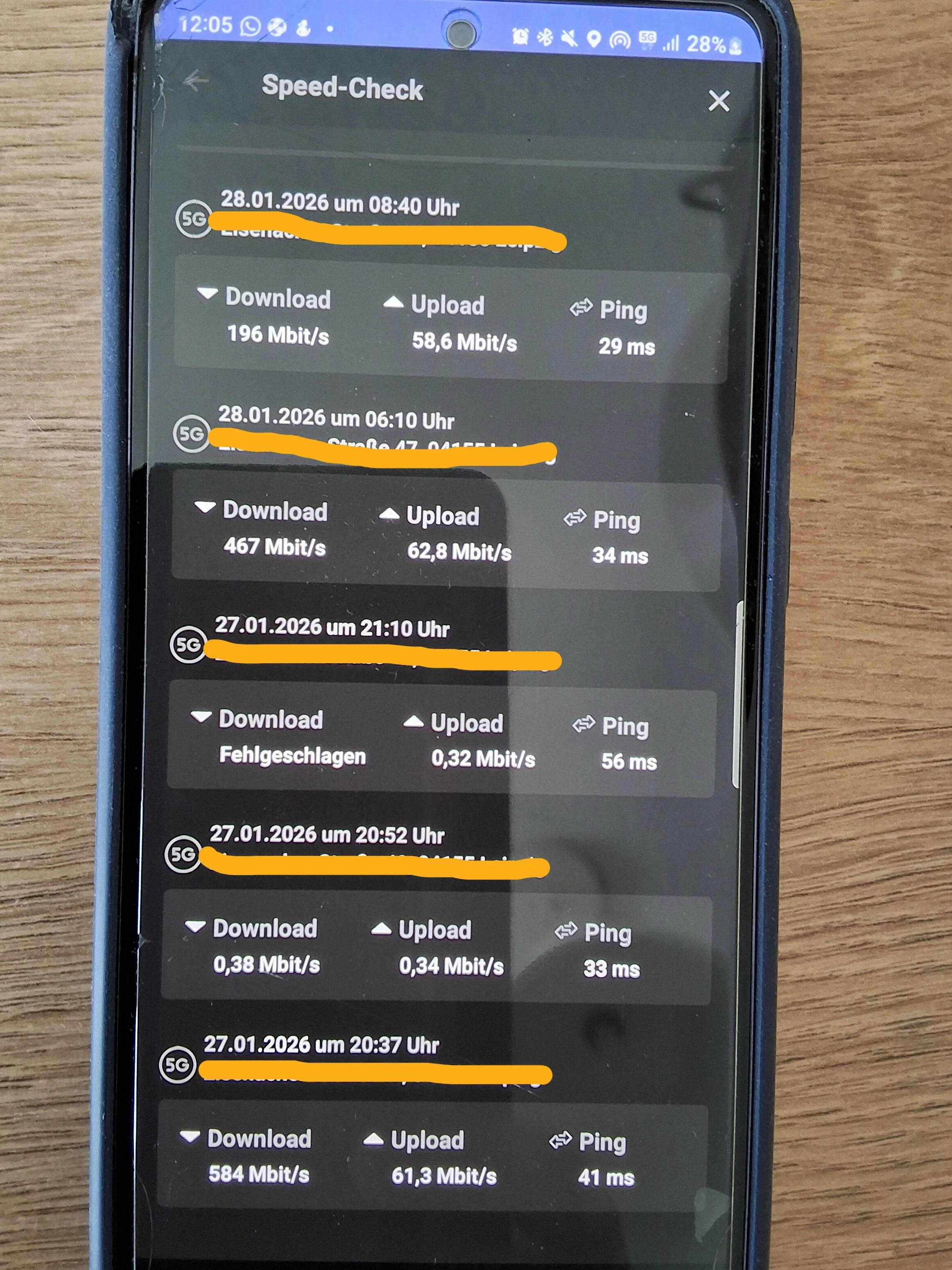 Die Störungen sind ganz plötzlich, ich habe manchmal über 300 mbits im Haus und 2 minuten später zeigt es mir 0.1 mbit oder ähnliches an und ich kann nichts mehr machen. Siehe auf dem Foto.  Liegt es an meinem Handy oder an was, denn bei mir in der nähe sollten genug Basisstationen sein, zumindest laut der Karte von O2