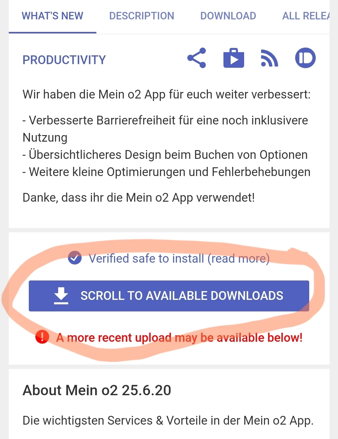 Vorher die neue Version deinstallieren,. Die dann runterladen und die apk die im Download des Handy liegt einfach installieren und wieder einloggen und KEIN Update aus dem Playstore machen was die mein o2 App betrifft