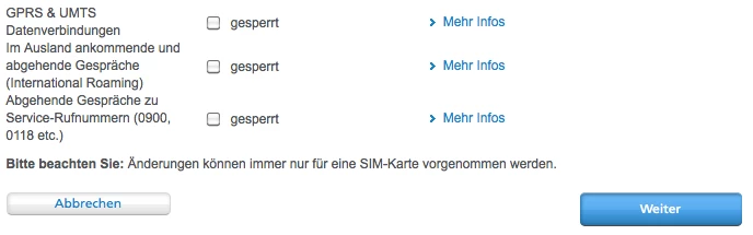 Unglücklicherweise suche ich mir einen Wolf und finde keine (intuitive) Möglichkeit, die Option abzubestellen. Unter "Daten & Verträge > Mein Mpbilfunk" habe ich mich durch sämtliche Punkte durchgeklickt. Ich finde die Surf-Flat Option lediglich halbtransparent vor mit dem Tooltip "bereits aktiviert", ohne Möglichkeit, die Checkbox zu deaktivieren. Woanders gibt es noch eine Möglichkeit, den Datenverkehr zu sperren, aber das scheint nicht mein Problem zu lösen.