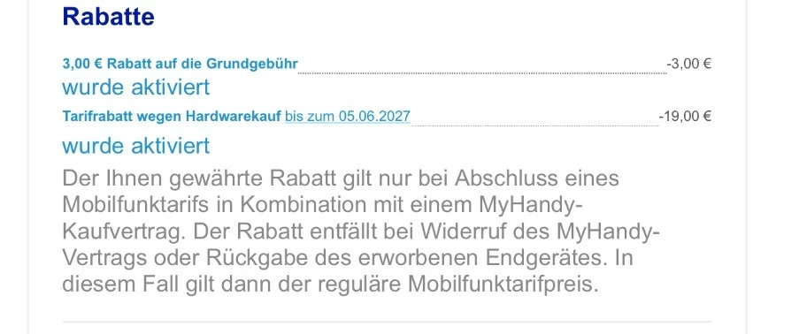 Ich bin verwirrt. Laut Tarifdetails (siehe Screenshot) läuft der Hardwarerabatt bis zum 05.06.2027.