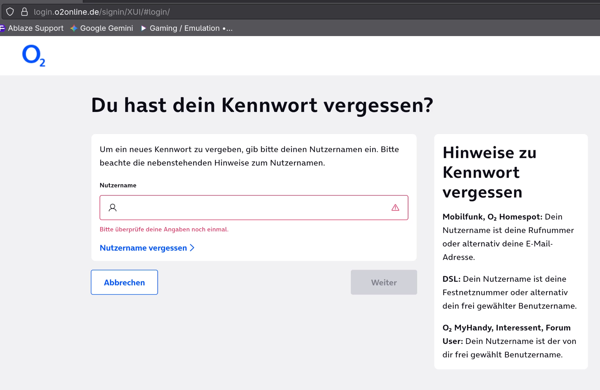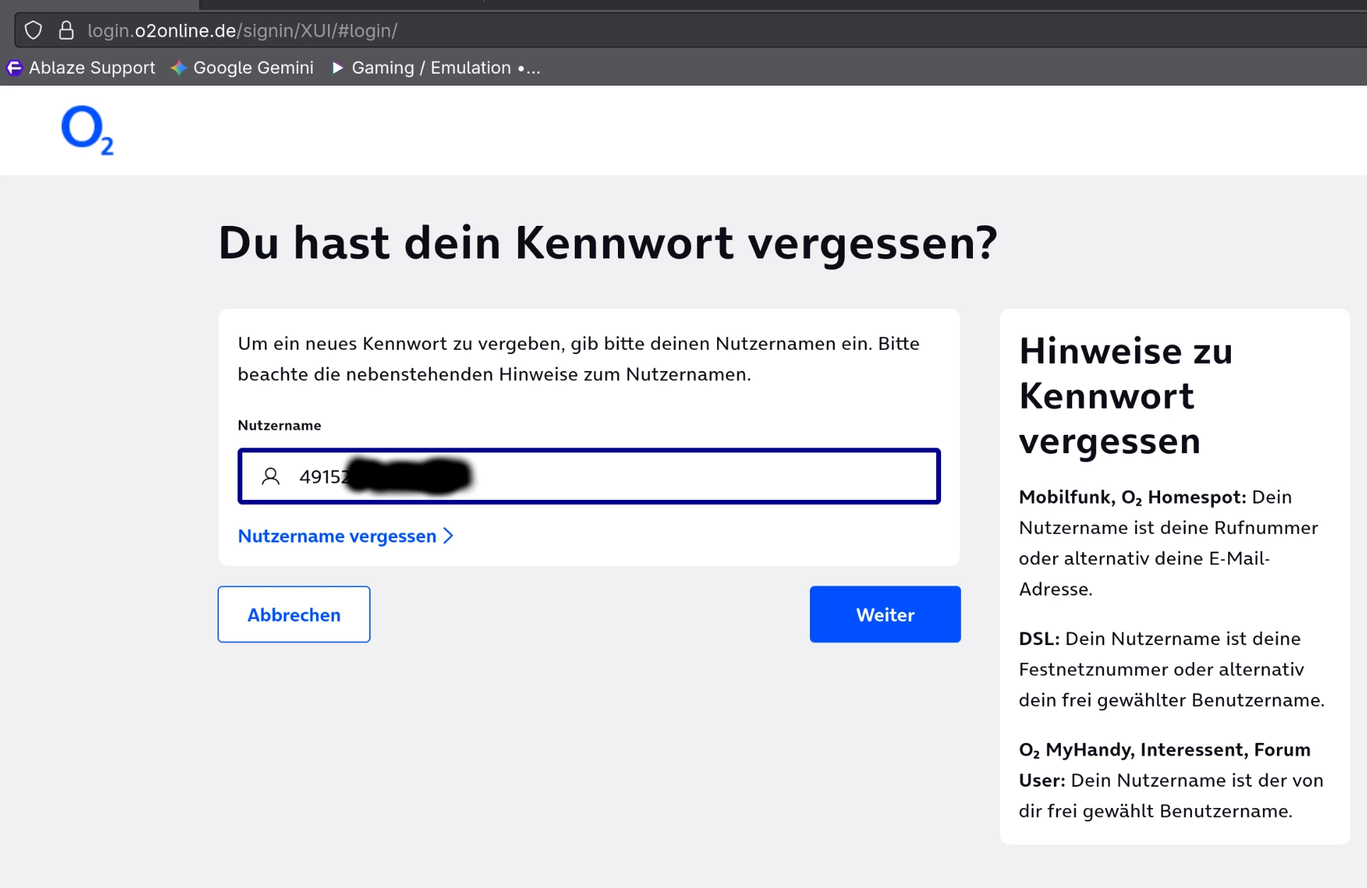 Auf Nutzername vergessen komme ich auch nicht weiter. Ich bin ja kein Homespot, DSL, Glasfaser, Kabel, oder MyHandy Kunde