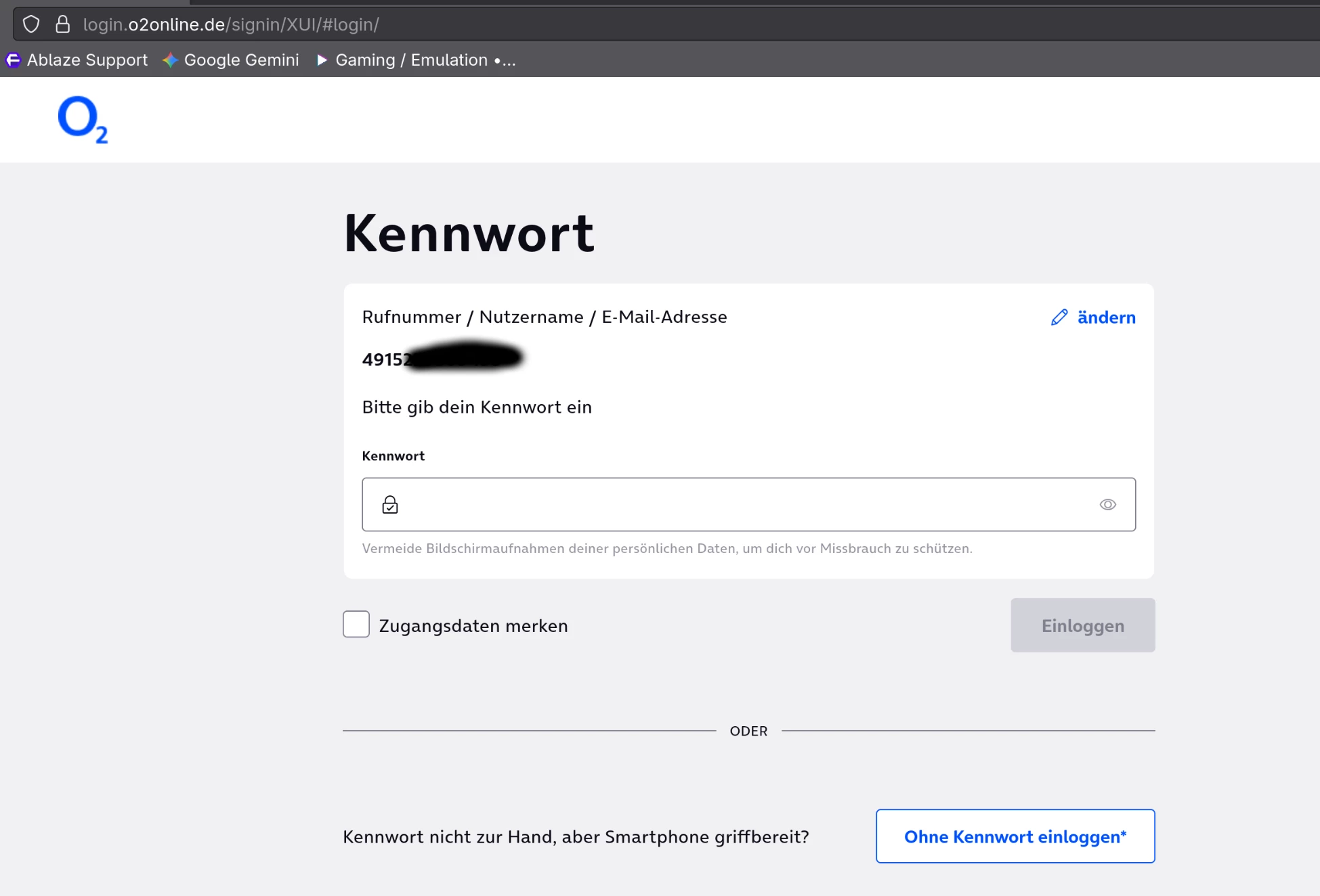Ich habe dann versucht, mich über die neue, übernommene Nummer zu registrieren, aber da werde ich an den Login weitergeleitet. Über Kennwort einloggen kann ich nicht, mir bekannte Kennwörter funktionieren nicht. Ohne Kennwort einloggen geht auch nicht