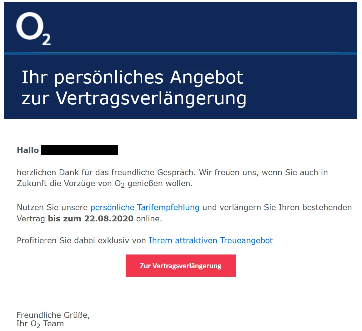 Am Telefon wurde mir ein Angebot zur vorzeitigen Verlängerung (Gültigkeit 7 Tage) unterbreitet, was er mir dann auch wenige Minuten zusätzlich per Mail zugeschickt hat. Dieses war aber zu dem Zeitpunkt nicht attraktiv für mich, so dass ich mich dazu entschlossen habe, mich erst kurz vor Vertragsende wieder mit dem Thema zu befassen.